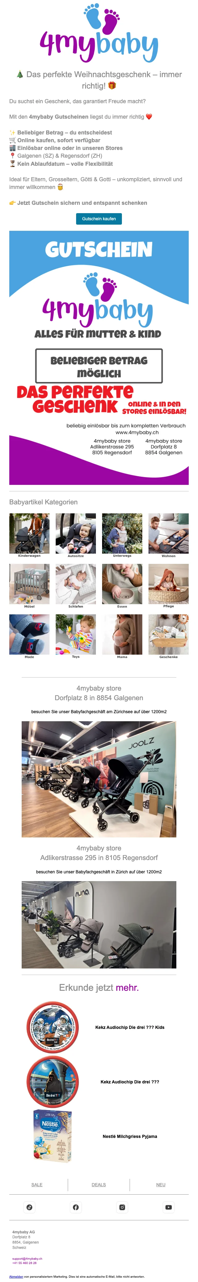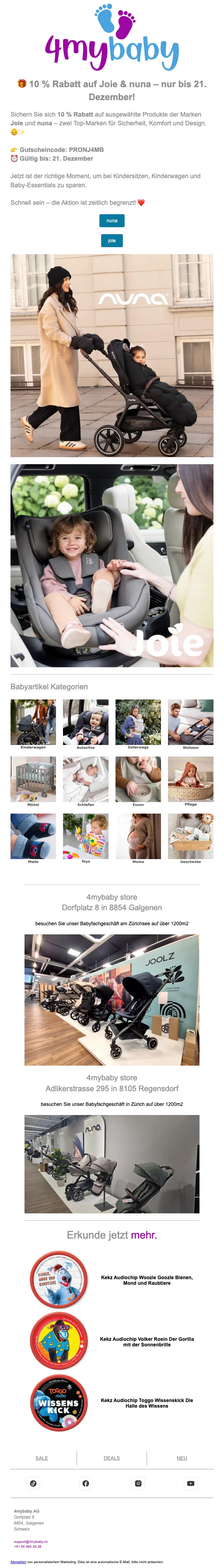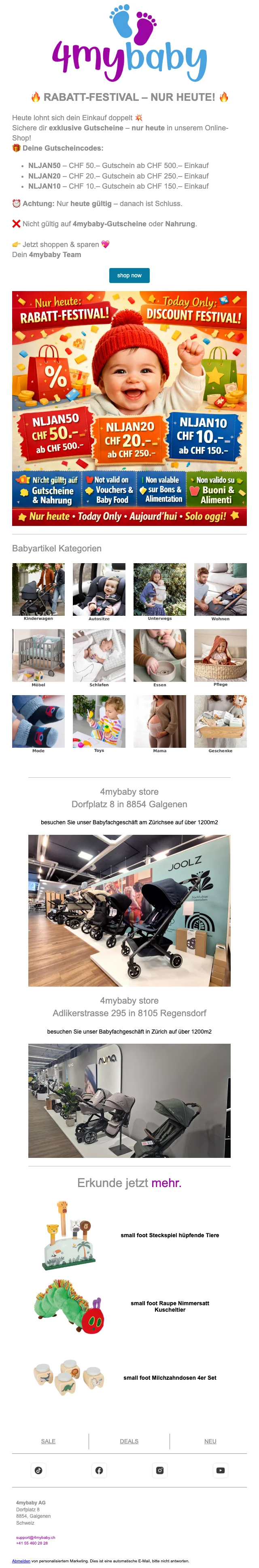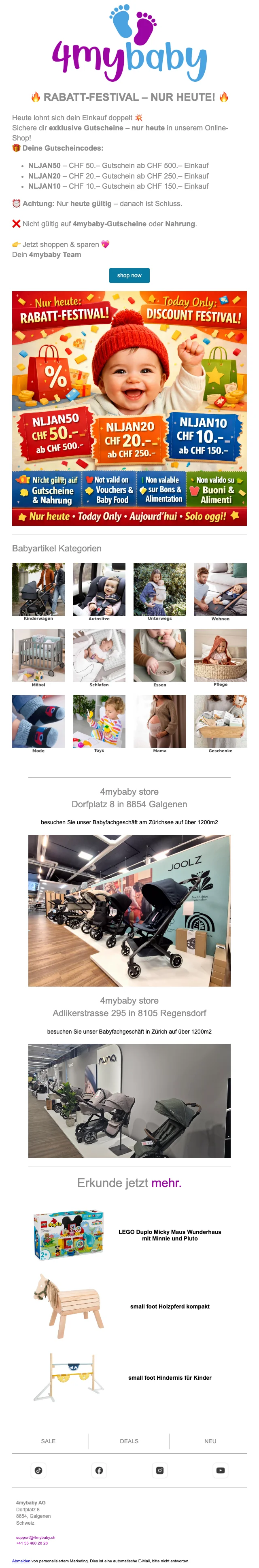Sichere dir 14% Extra-Rabatt auf alle Chicco-Artikel ab einem Einkaufswert von CHF 140.–. Gilt online sowie in den Filialen in Regensdorf und Galgenen; Aktion endet am 15. Februar.