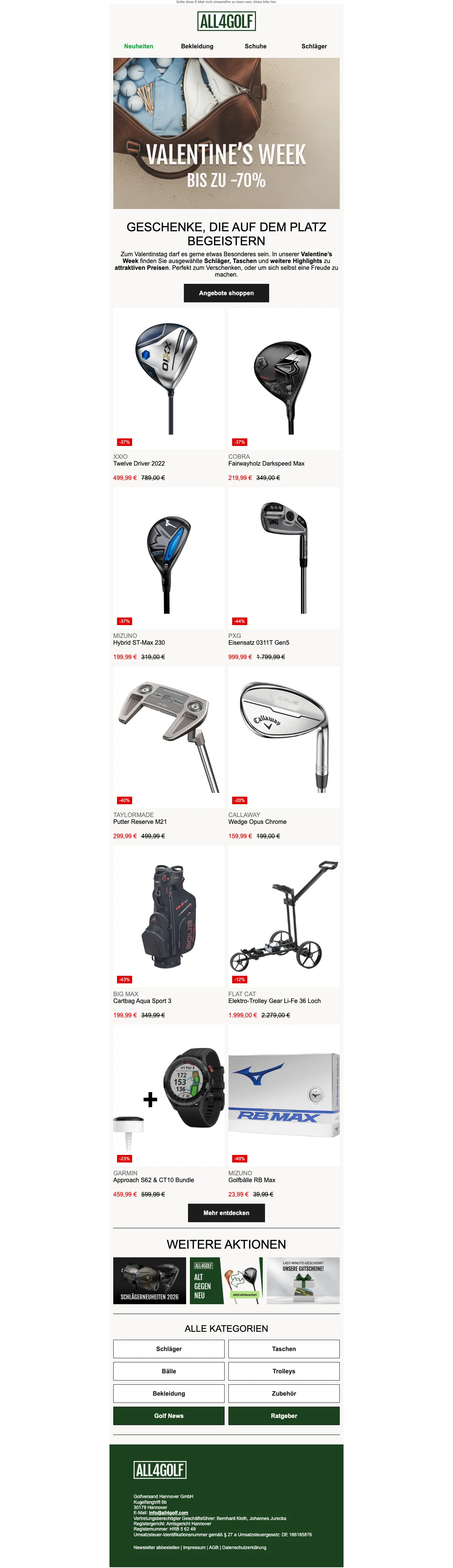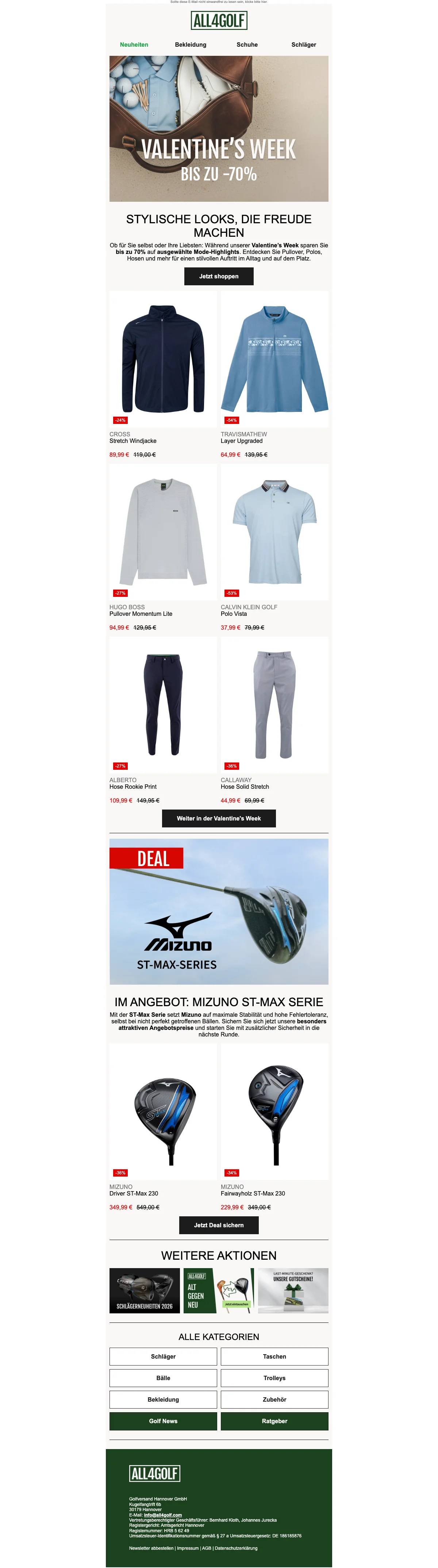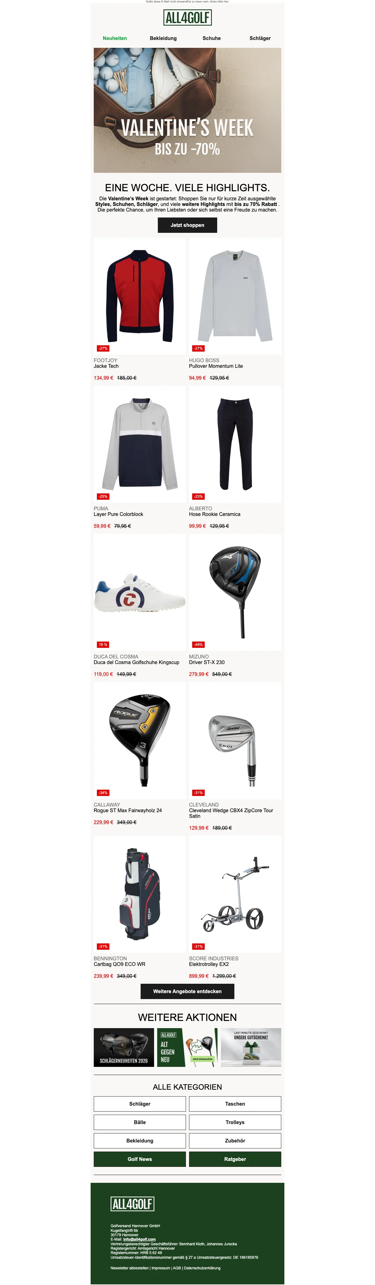 All4Golf Valentine's Week Mode-Highlights bis zu 70% auf Bekleidung