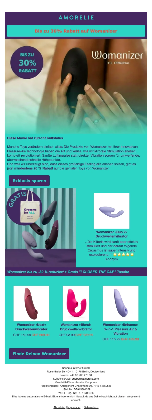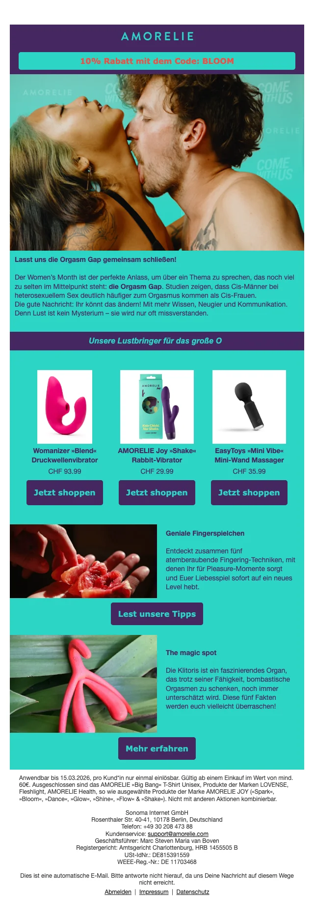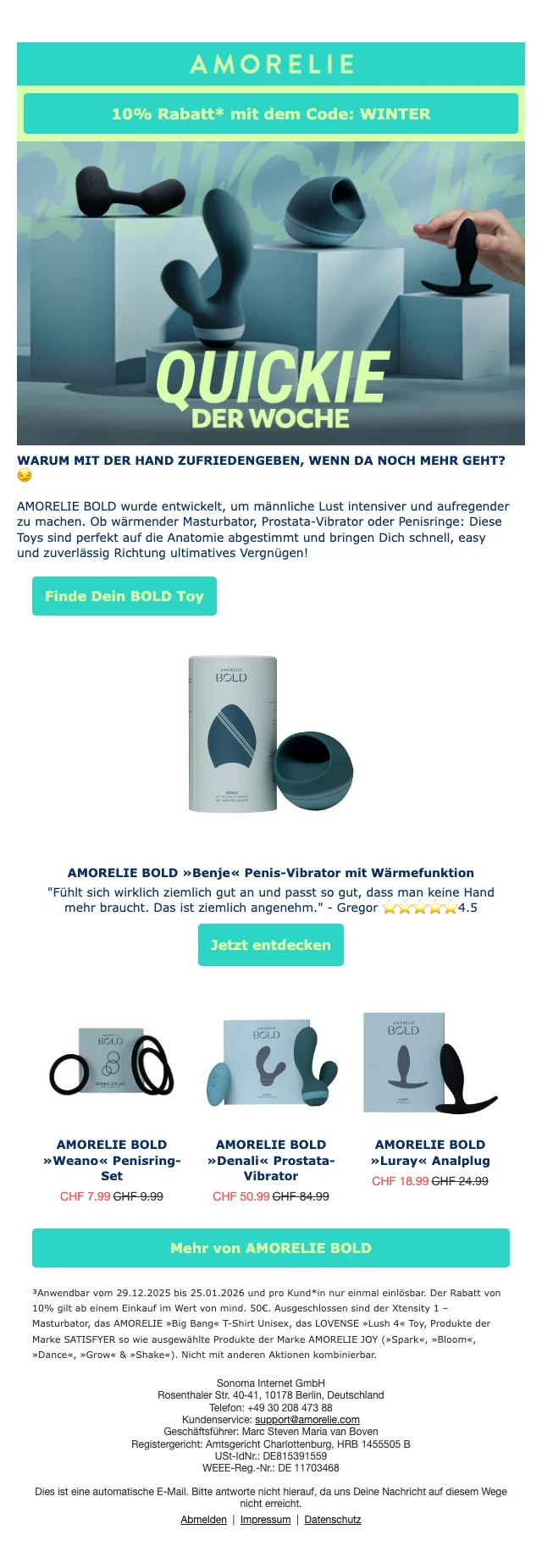 | AmorelieDUCK14 | Exklusiver Amorelie Rabattcode: Spare CHF 14.- auf das gesamtes Angebot |