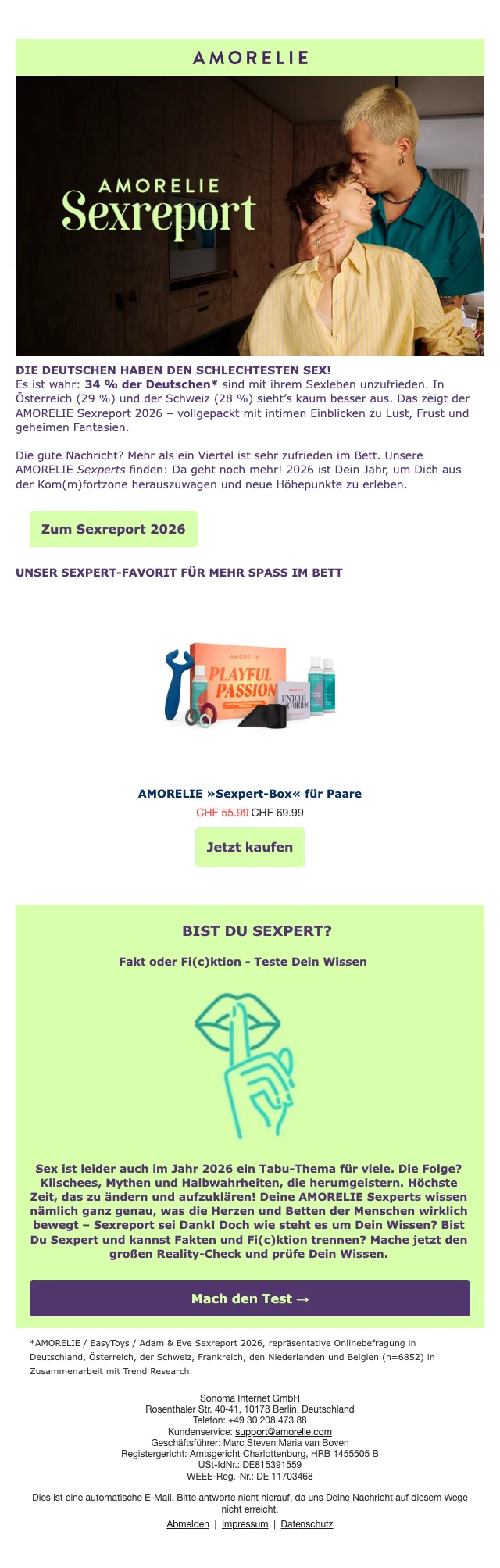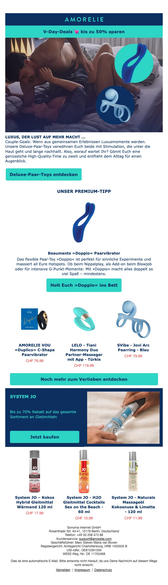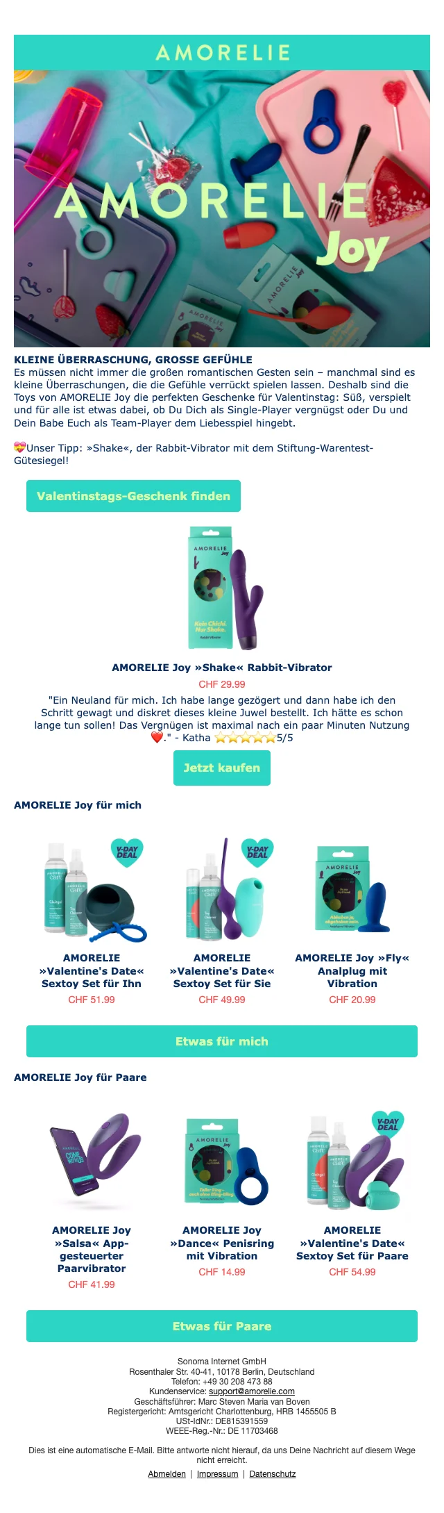 Wir prüfen alle Newsletter von Amorelie für Sie, um die besten Angebote zu finden. Schauen Sie sich ihre neuesten Newsletter an.