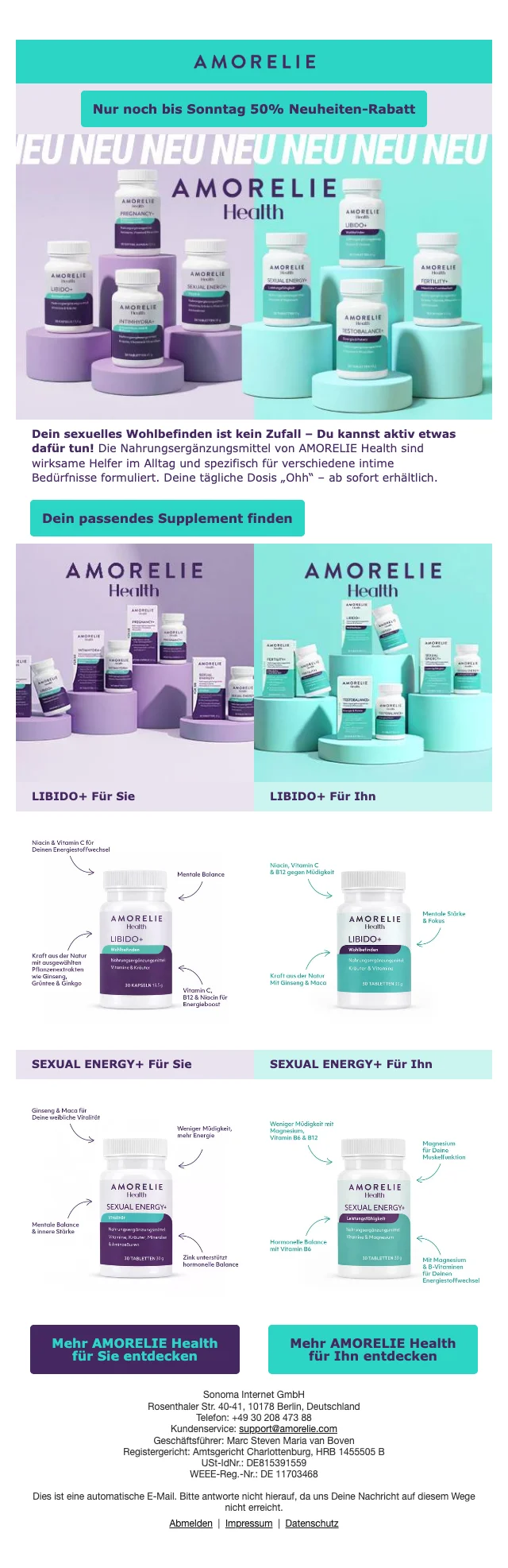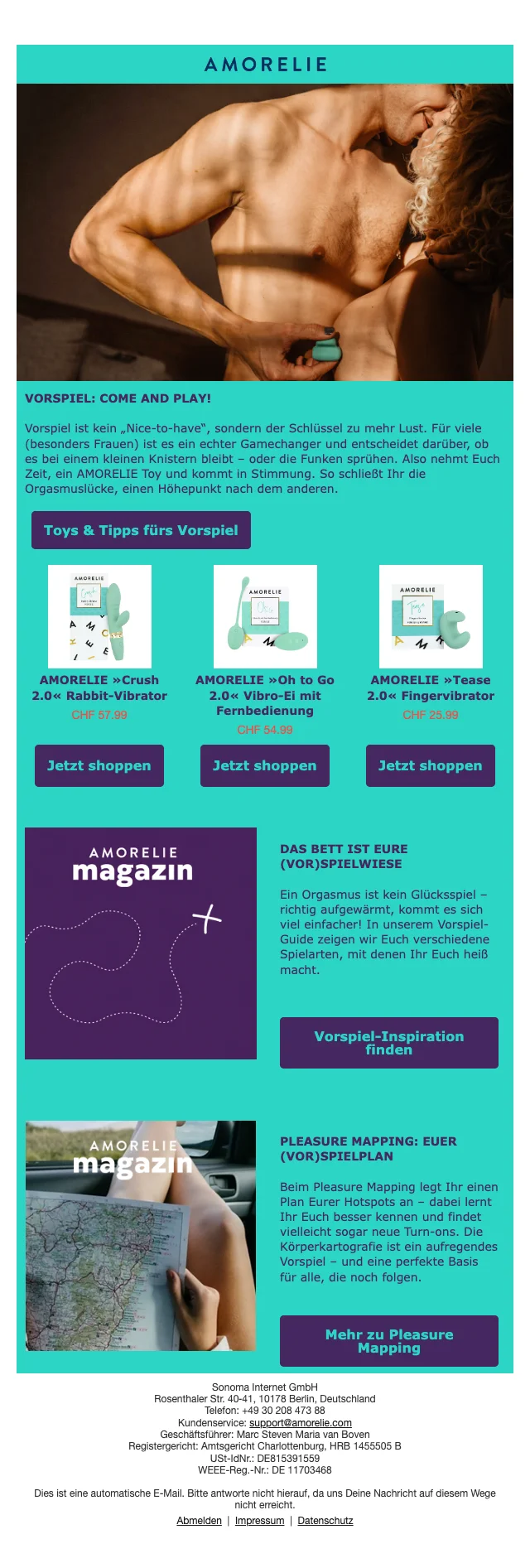Filme wie "Fifty Shades of Grey" haben den Umgang mit Sexualität und Sinnlichkeit in der Gesellschaft verändert. Als sich das Image der Erotik-Branche im positiven Wandel befand, gingen die Gründer Lea-Sophie Cramer und Sebastian Pollok im Jahr 2013 mit ihrem Sexshop Amorelie in Berlin online. Beide Gründer setzten mit ihrer Idee auf ein abwechslungsreiches Liebesleben für glückliche Beziehungen und erhofften sich durch die offene Kommunikation über Sex eine Selbstverständlichkeit und Aufgeschlossenheit darüber in der Gesellschaft zu schaffen. Und die Bestellungen von modernen, selbstbewussten Paaren und Frauen ließen nicht lange auf sich warten. In kürzester Zeit war die Kundschaft vom exklusiven Ambiente des Onlineshops überzeugt und hoben Amorelie in Riege der führenden deutschen Sex Onlineshops für sinnlichen Lifestyle. Seither arbeiten in der Berliner Zentrale täglich fleißige MitarbeiterInnen daran, Ihr Liebesleben noch aufregender zu gestalten. Neben Deutschland ist der Online-Shop auch in den Ländern Österreich, Schweiz, Frankreich und Belgien vertrieblich vertreten.