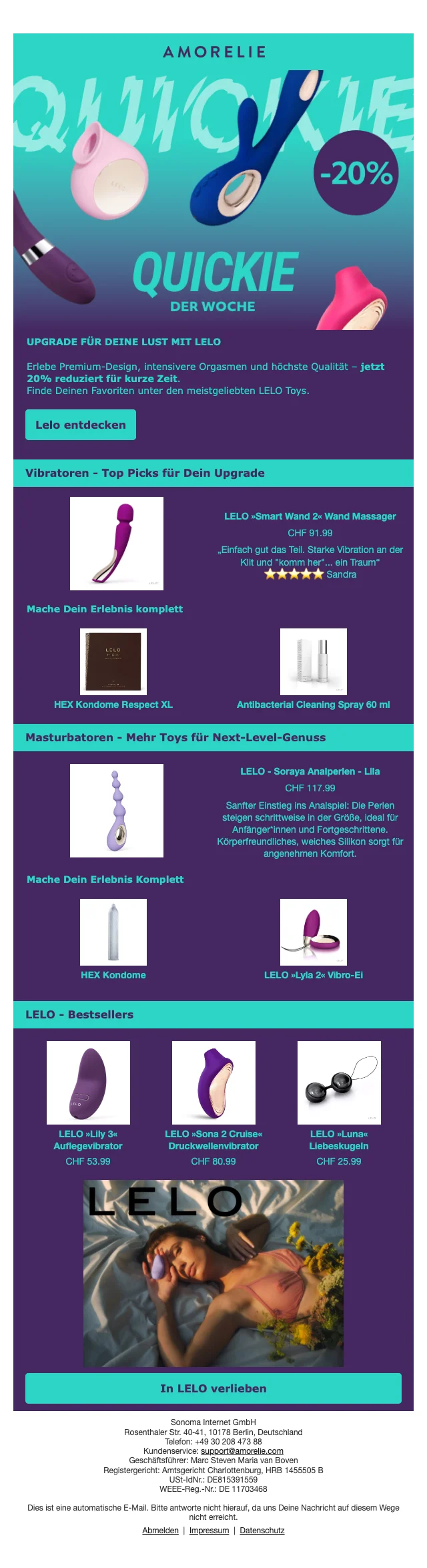 Sichere dir 20 % Rabatt auf die Premium Toys und Gleitmittel von LELO und Pjur. Genieße hochwertige Produkte, die deine Intimität auf ein neues Level heben. Jetzt ist der perfekte Zeitpunkt, um dir etwas Besonderes zu gönnen!