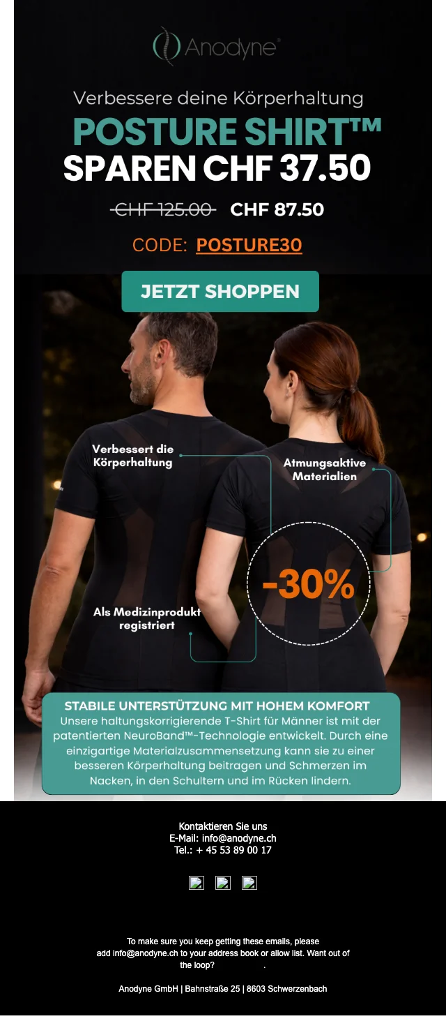 Nur auf anodyne.ch erhältst du die originale haltungskorrigierende Kleidung, die sowohl FDA- als auch MDR/CE-registriert ist.