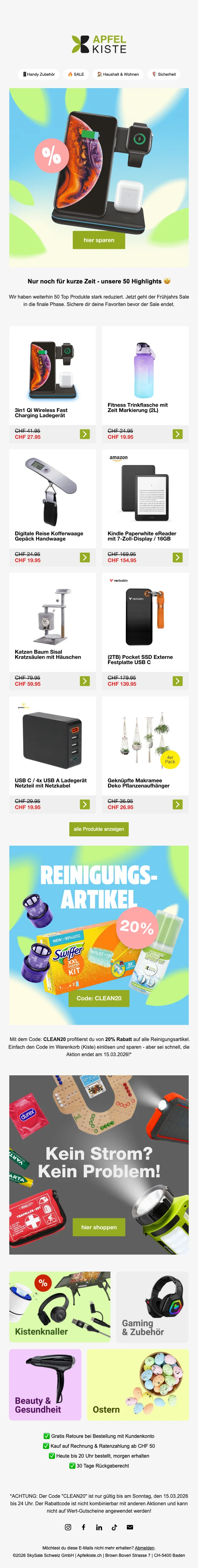 Apfelkiste ist der Schweizer Online-Shop für Zubehör, Ersatzteile und Accessoires. Hier bekommst du alles was du für dein Smartphone, Tablet oder Computer brauchst! Ob Apple, Samsung, Nokia, Sony, HTC, Blackberry, LG, Asus, Amazon Kindle, Motorola, Huawei, Acer oder Microsoft Zubehör, mit dem Apfelkiste Gutschein gibt's all das für wenig Geld. Außerdem kannst du auf apfelkiste.ch auch Kopfhörer, Headsets, Gadgets und Geschenkideen erwerben. Mit den Gutscheincodes von Saleduck kannst du dir tolle Angebote und Rabatte sichern.