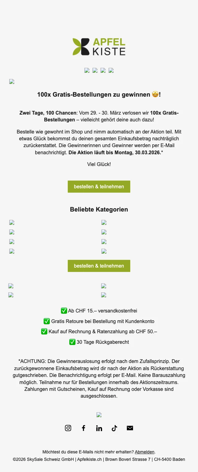 Auch preislich gesehen bietet dir apfelkiste.ch den besten Service in Form der Bestpreis Garantie. Solltest du einen gekauften Artikel bei einem Mitbewerber im Inland zu einem günstigeren Preis finden, dann erstattet dir apfelkiste.ch die Differenz und schenkt dir sogar noch einen Franken zusätzlich. Damit bist du sicher, dass du immer den besten Preis erhältst.