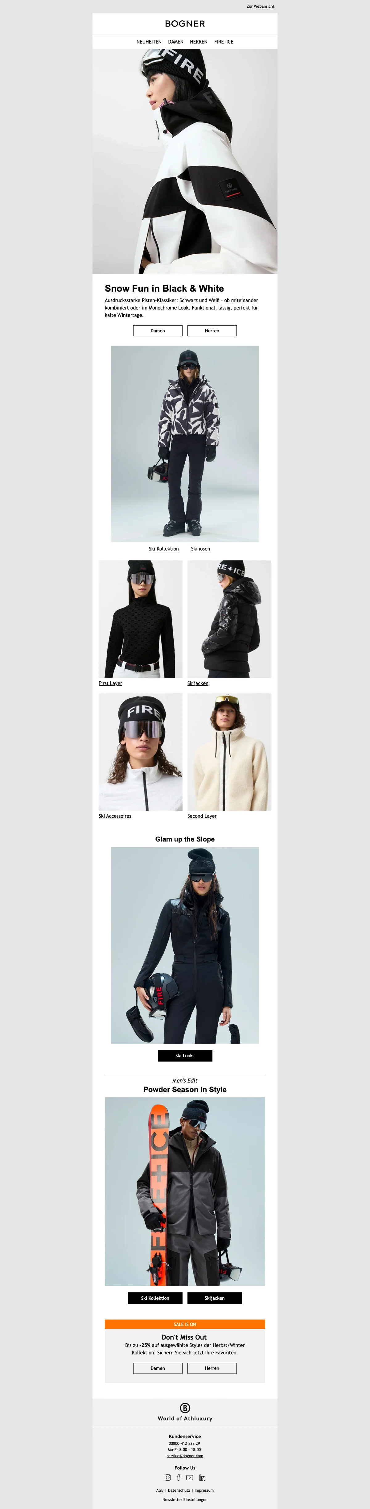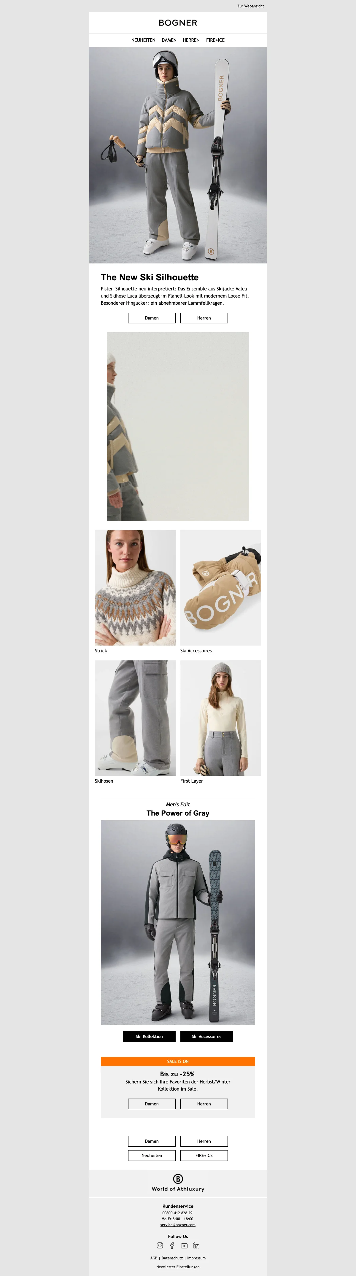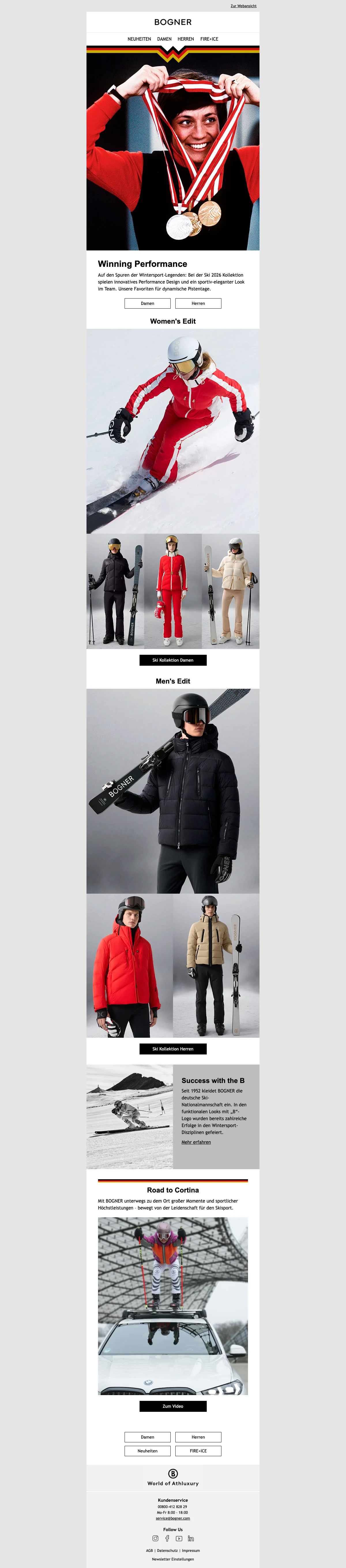 Bogner steht seit Jahrzehnten für hochqualitative Schneesportmode. Sportbekleidung, Sportausrüstung und Accessoires. Bogner wurde in den 1930er Jahren von dem Deutschen Profi Wintersportler, Willy Bogner, gegründet. Zuerst funktionierte Bogner als Ski-Import Geschäft für Skier und Zubehör aus Norwegen. Nach einigen Jahren begann Bogner damit, eigene Kleider herzustellen und wurde 1937 Ausstatter der Deutschen Mannschaft für die Olympischen Winterspiele in Garmisch-Partenkirchen. In den 1970er Jahren begann Bogner erstmals damit auch Kollektionen für andere Sportarten, namentlich Langlauf, Golf- und Tenniskleider herzustellen. Seit den Olympischen Sommerspielen 2012 in London ist Bogner auch offizieller Ausstatter der Deutschen Mannschaft bei den Sommerspielen.