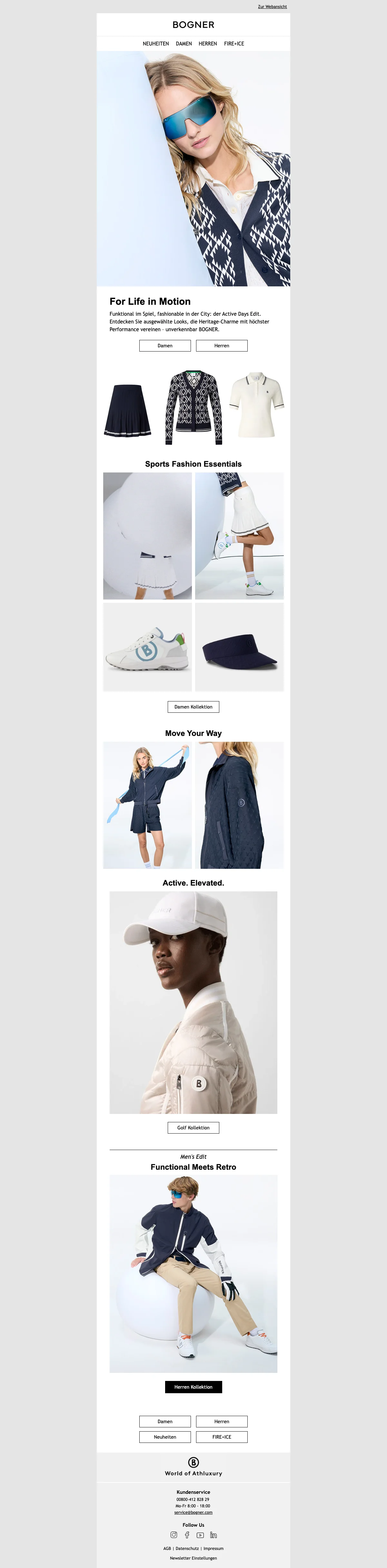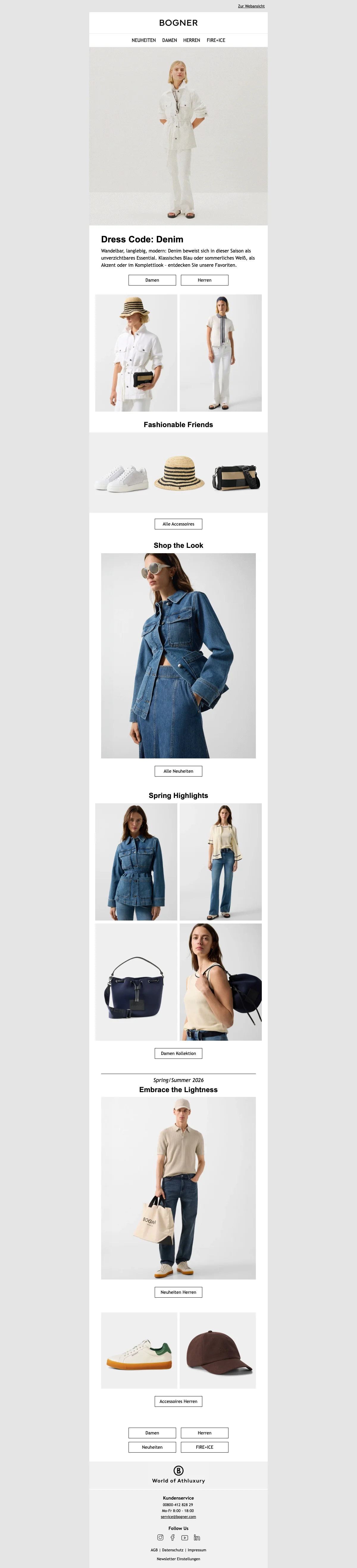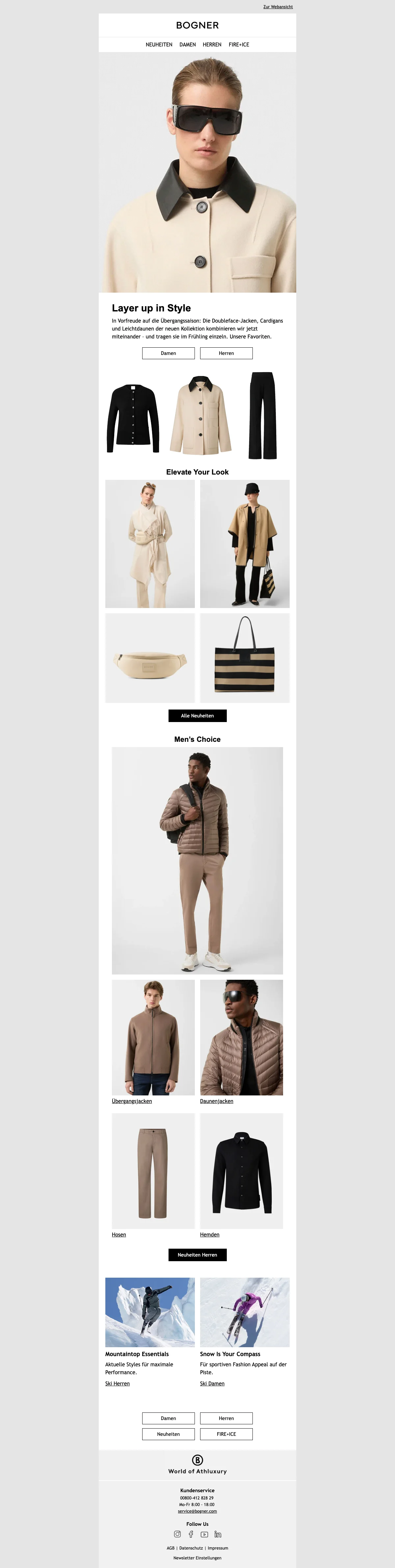 Bogner steht seit Jahrzehnten für hochqualitative Schneesportmode. Sportbekleidung, Sportausrüstung und Accessoires. Bogner wurde in den 1930er Jahren von dem Deutschen Profi Wintersportler, Willy Bogner, gegründet. Zuerst funktionierte Bogner als Ski-Import Geschäft für Skier und Zubehör aus Norwegen. Nach einigen Jahren begann Bogner damit, eigene Kleider herzustellen und wurde 1937 Ausstatter der Deutschen Mannschaft für die Olympischen Winterspiele in Garmisch-Partenkirchen. In den 1970er Jahren begann Bogner erstmals damit auch Kollektionen für andere Sportarten, namentlich Langlauf, Golf- und Tenniskleider herzustellen. Seit den Olympischen Sommerspielen 2012 in London ist Bogner auch offizieller Ausstatter der Deutschen Mannschaft bei den Sommerspielen.