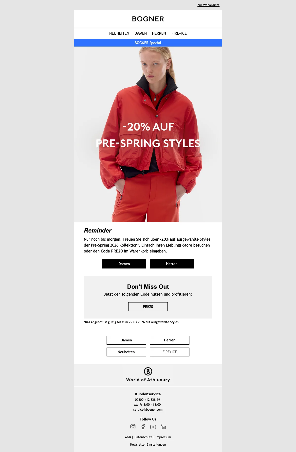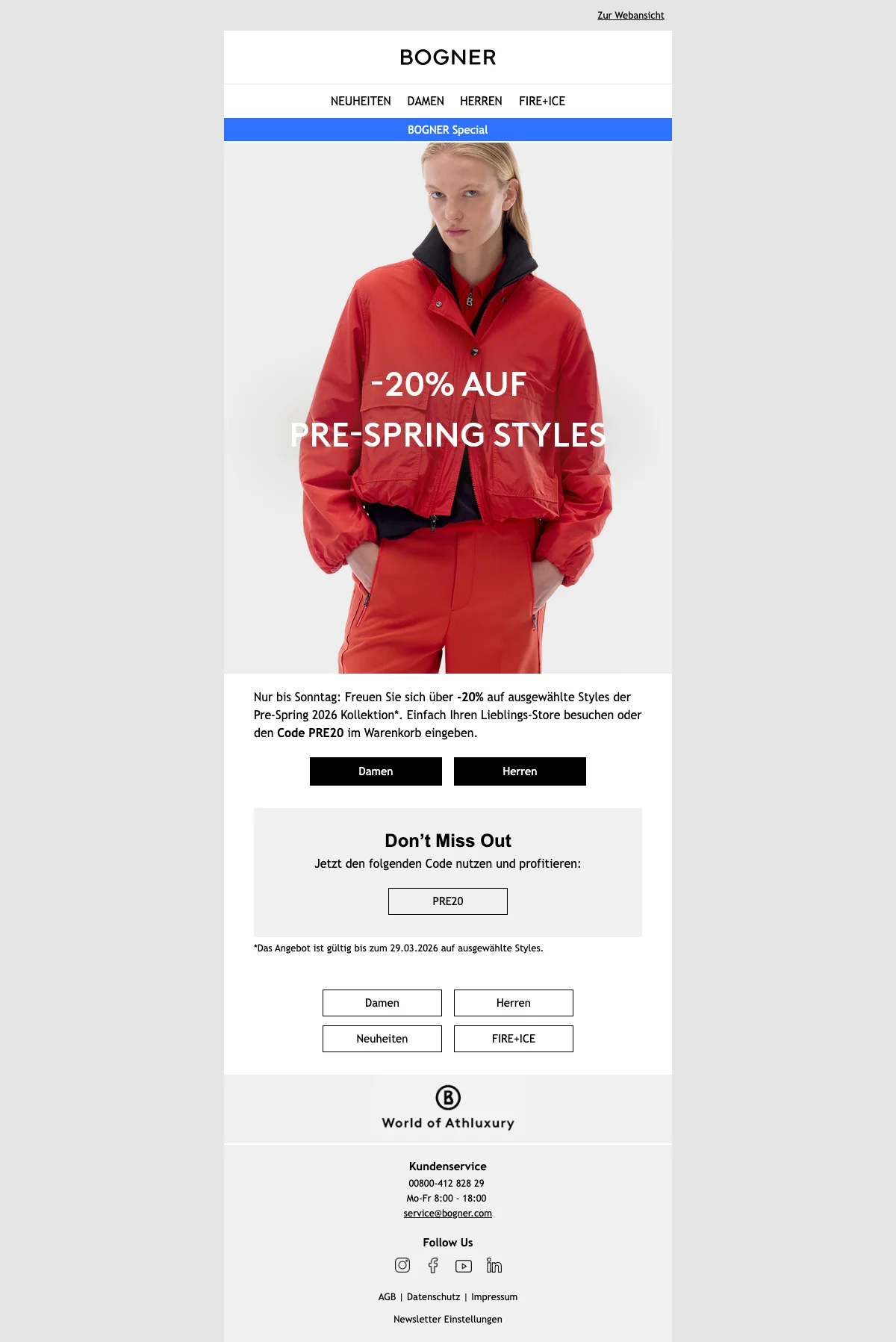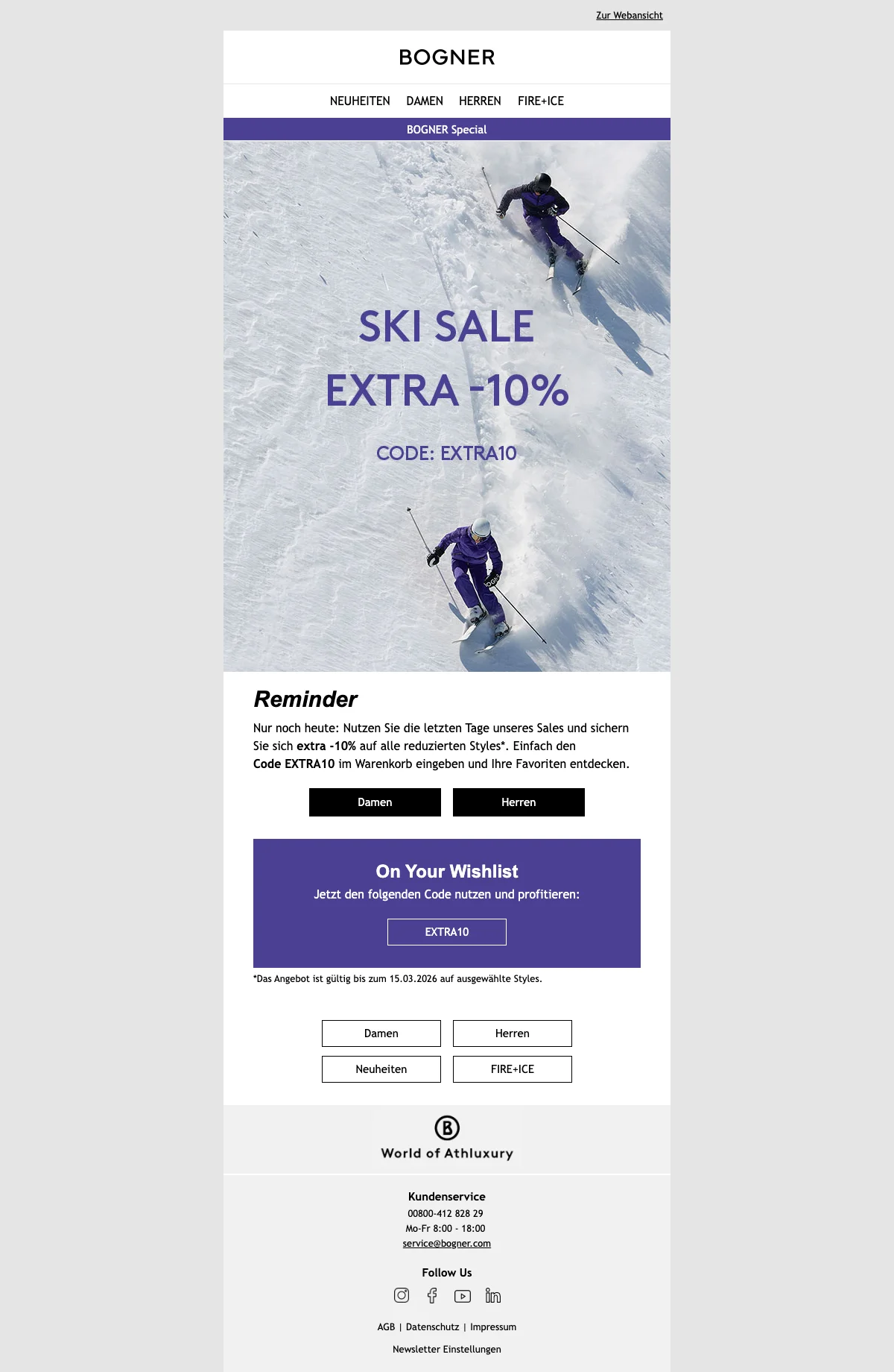 Saleduck kann dir helfen, bei deinem nächsten Einkauf bei Bogner viel Geld zu sparen. Behalte deine Augen auf unserer Homepage, denn immer wieder findest du Gutscheine, Rabattcodes und Aktionen. Sichere dir die Gutscheincodes von Bogner und hole dir moderne und hochqualitative Wintermode und spare dank den Gutscheinen und Rabatten erst noch Geld.