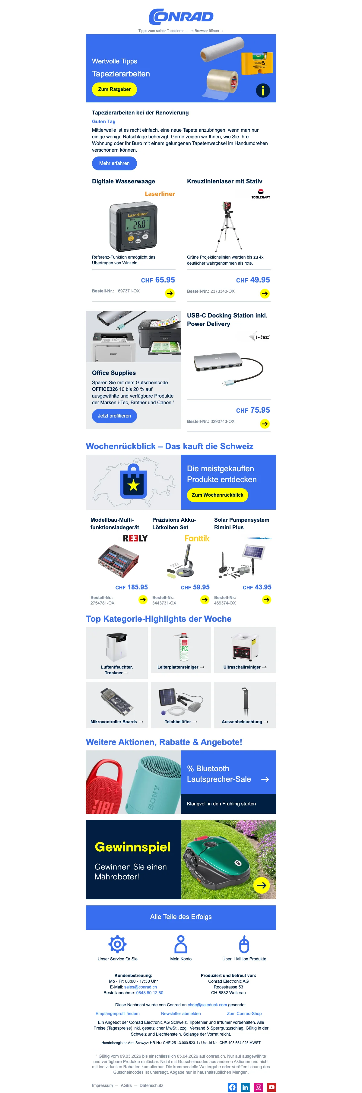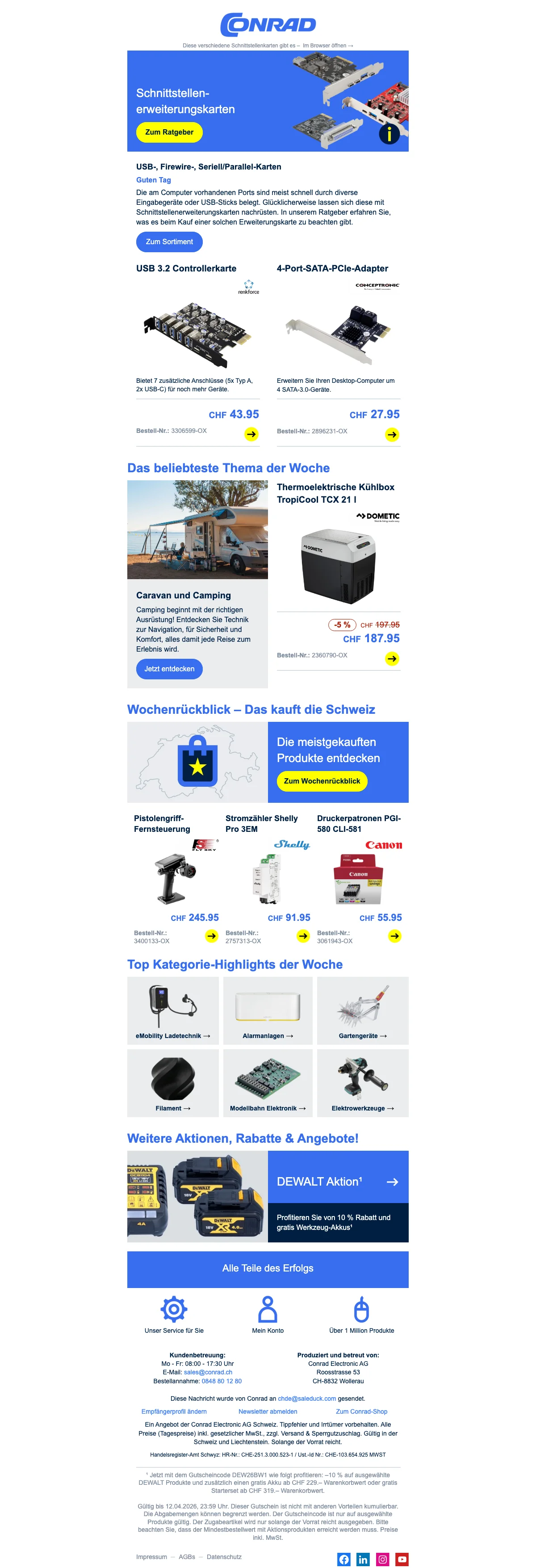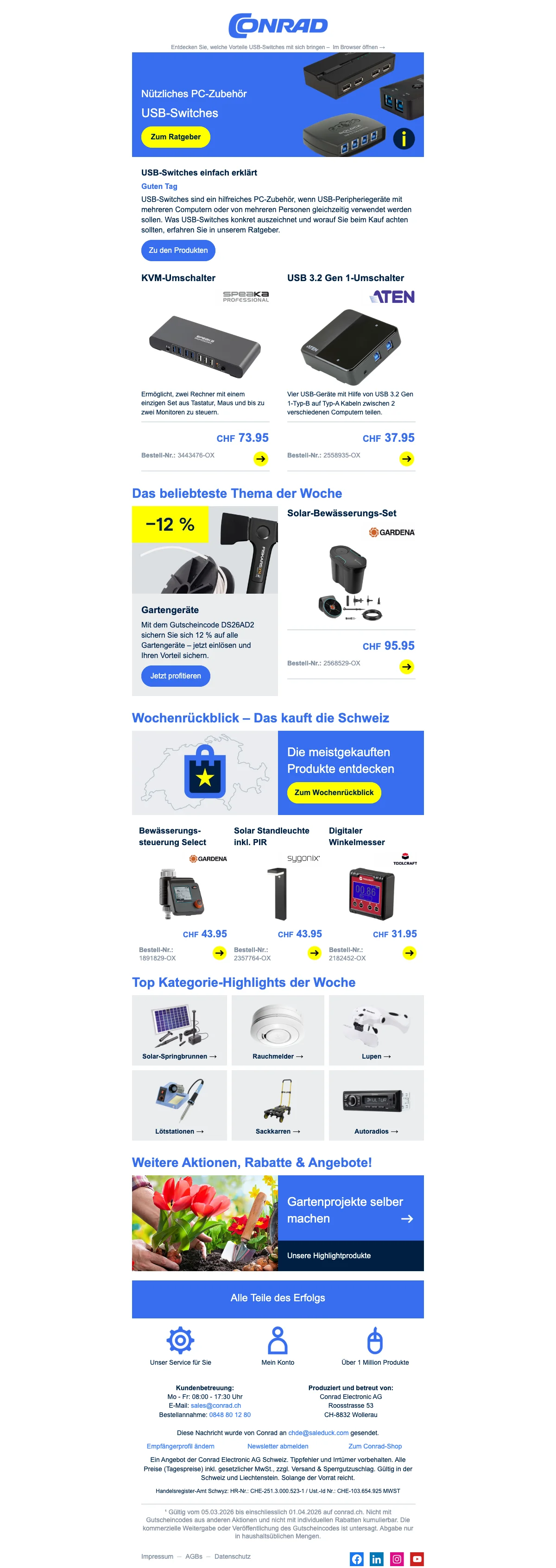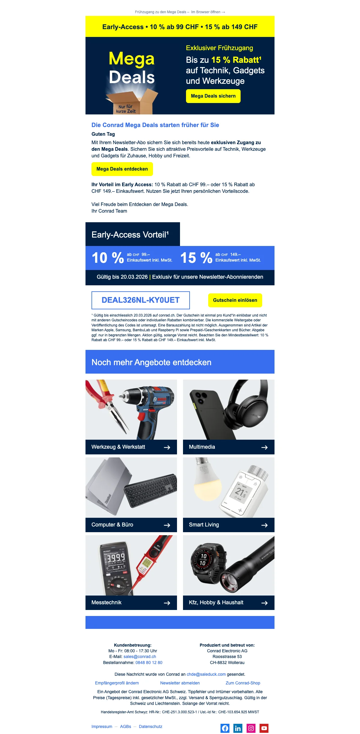 Conrad.ch bietet seinen Kunden stets gute Preise und viele Sonderaktionen und Rabatte. Nutze auch die Gutscheincodes von Saleduck.ch, um immer die besten Rabatte und Angebote zu erhalten. So einfach kannst du jede Menge Geld beim Elektronik-Einkauf sparen.