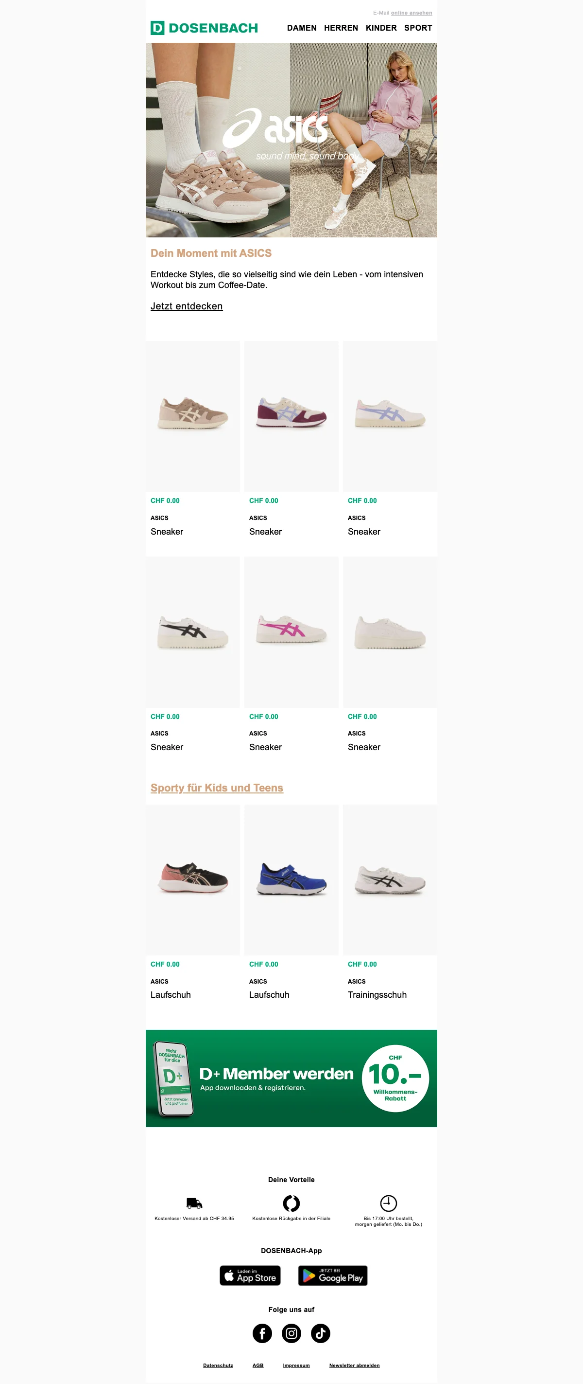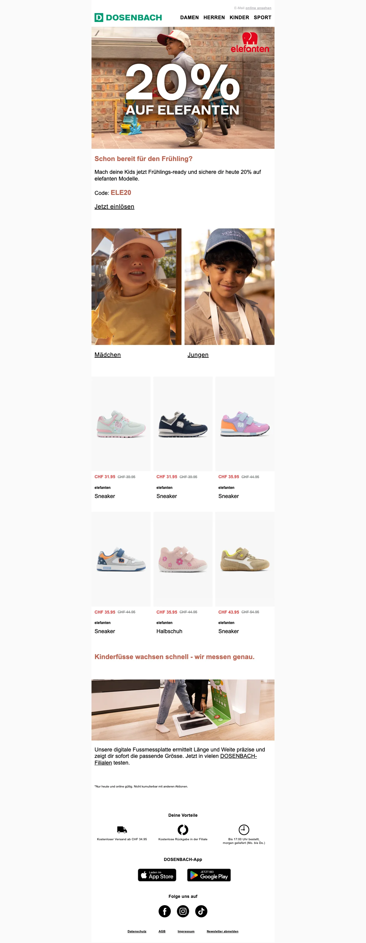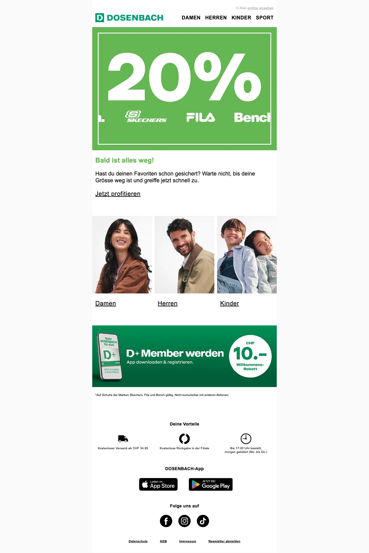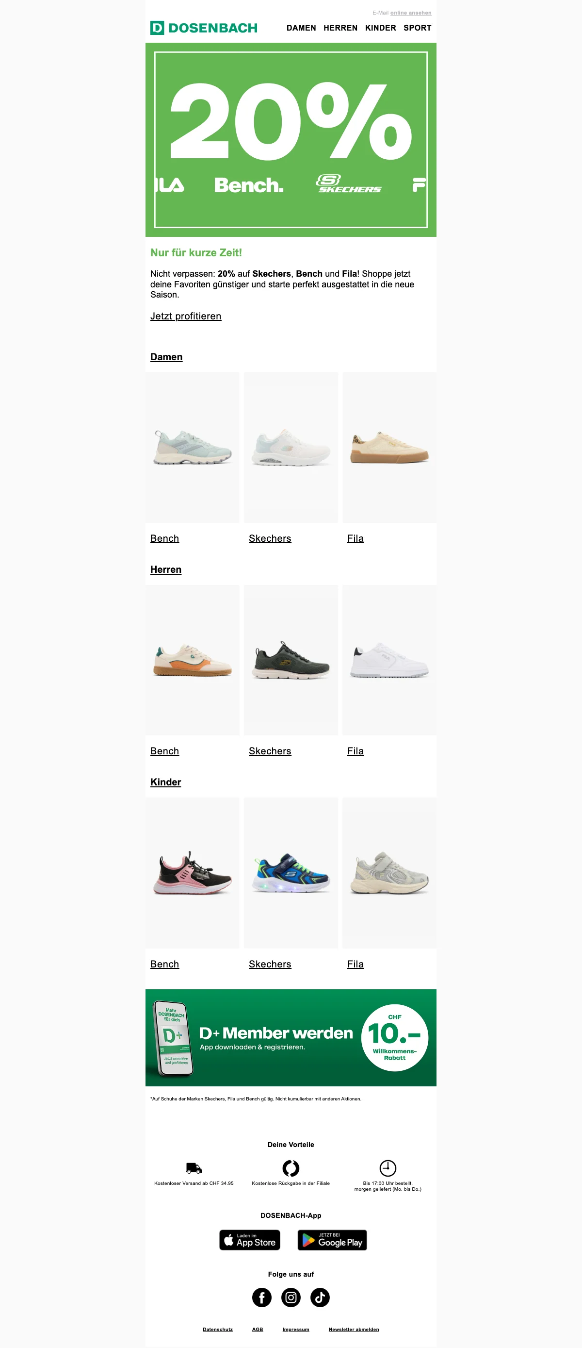 Sichere dir heute 20 % Rabatt auf eine große Auswahl an beliebten Markenstyles. Das Angebot gilt für Schuhe, Bekleidung und Accessoires und ist nur für kurze Zeit verfügbar. Genieße außerdem kostenlosen Versand ab CHF34.95!