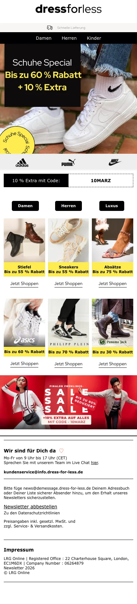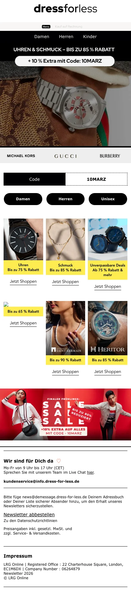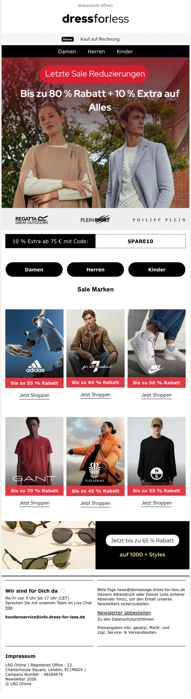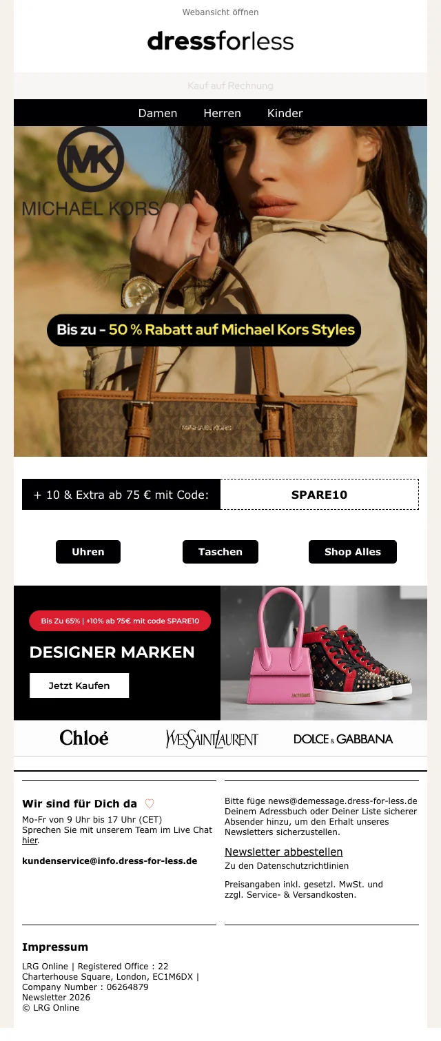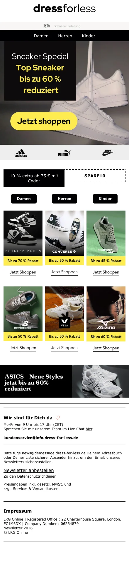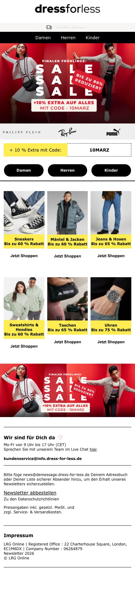 Alle Shopping Queens aufgepasst! Bei dress for less kannst du Designerklamotten für einen unschlagbaren Preis kaufen. Das Marken-Outlet bietet seinen Kunden Mode von bekannten Fashion-Labels mit bis zu 70 % Rabatt. Durchstöbere das Online Sortiment und bestelle Kleider, Jacken, Jeans, Unterwäsche, Schuhe und Accessoires von den bekanntesten Modemarken. Lass dir keinen Sale entgehen und melde dich für den Newsletter an. Nutze exklusive Deals, um zusätzlich auf verschiedene Artikel zu sparen. Ob elegant oder sportlich, hier findest du das passende Outfit für jede Gelegenheit.