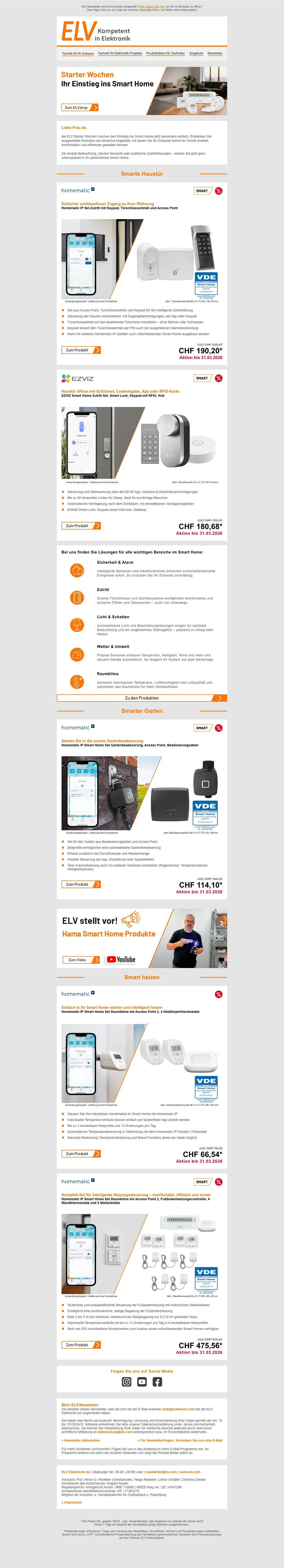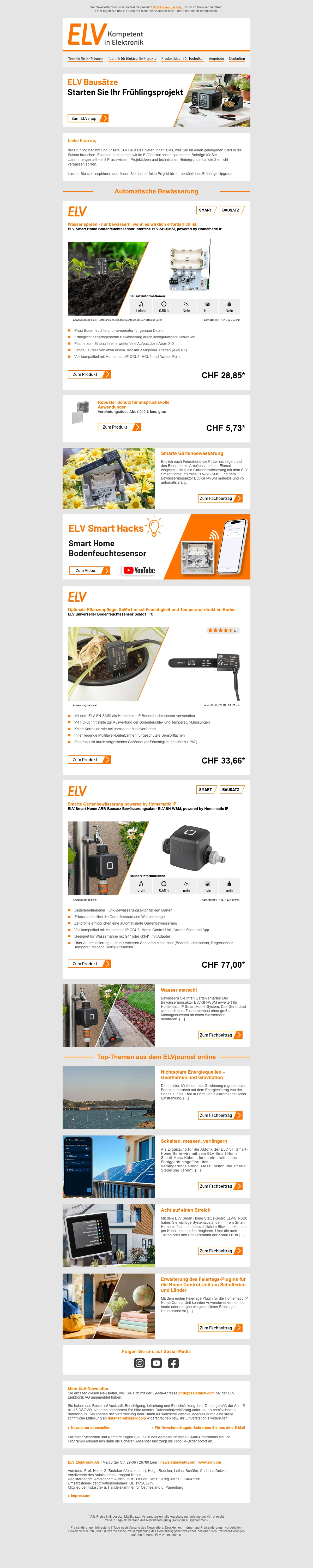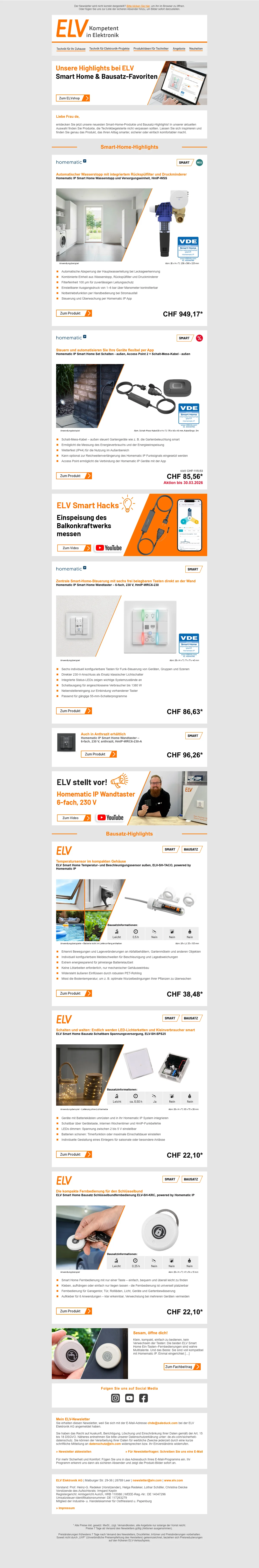 Da das Team von ELV sehr passioniert ist und selbst gerne bastelt und schraubt, gibt es für die Kunden einen gratis Newsletter mit vielen Tipps, Tricks und Erfahrungsberichten über die verschiedensten Themen. Wenn man sich neu für den Newsletter anmeldet erhält man außerdem einen CHF 5 Gutschein.