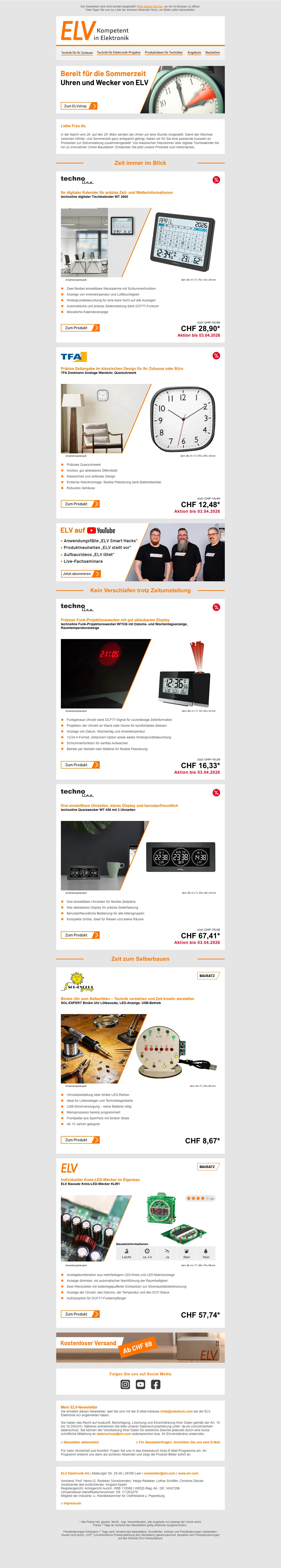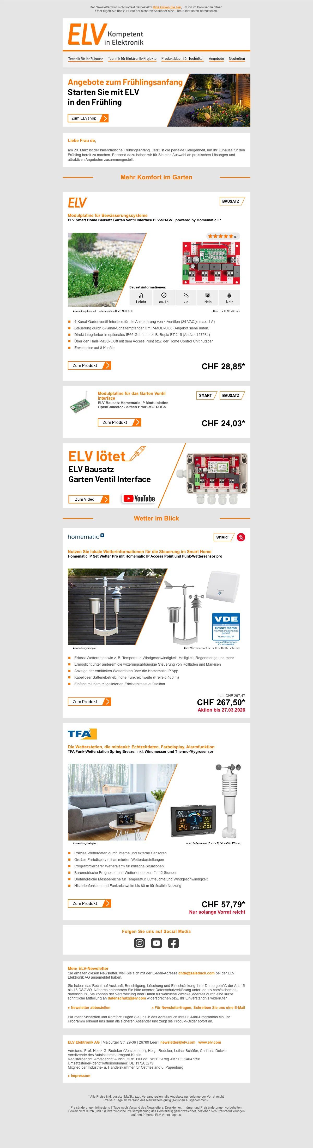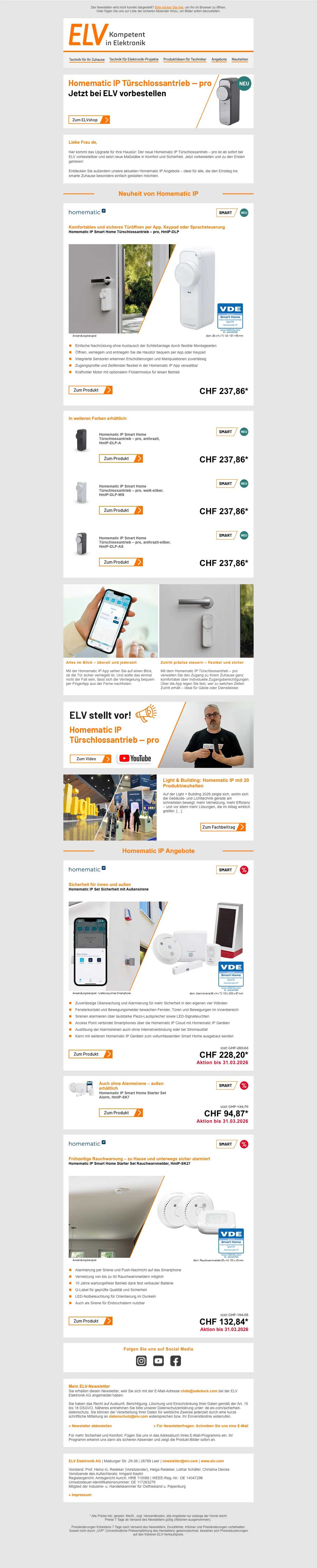 Da das Team von ELV sehr passioniert ist und selbst gerne bastelt und schraubt, gibt es für die Kunden einen gratis Newsletter mit vielen Tipps, Tricks und Erfahrungsberichten über die verschiedensten Themen. Wenn man sich neu für den Newsletter anmeldet erhält man außerdem einen CHF 5 Gutschein.