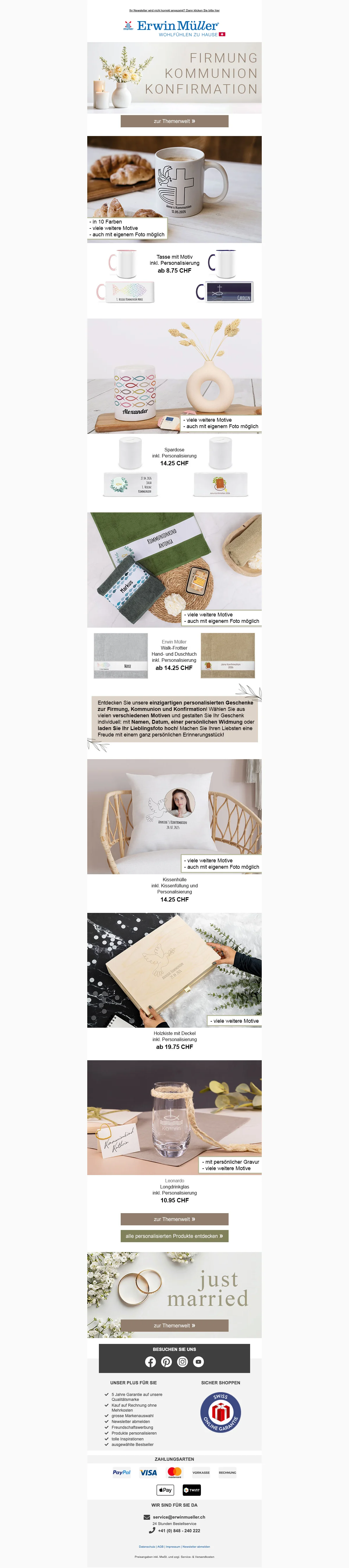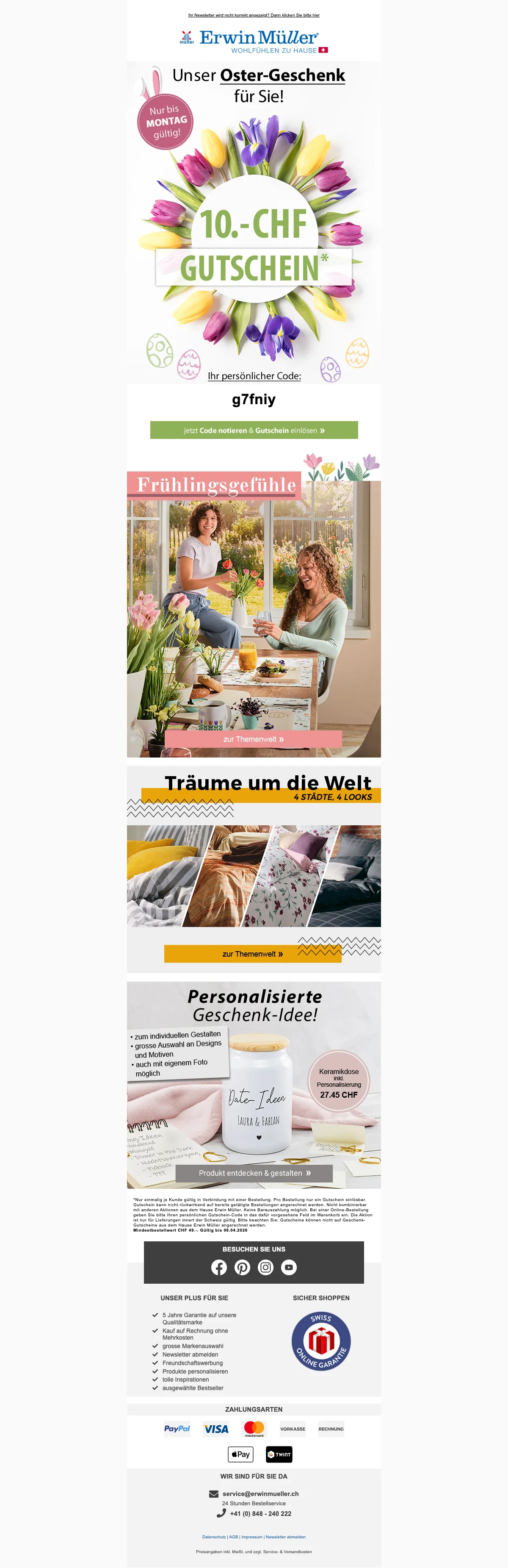Zwei kleine Spar-Tipps von uns: Wenn auch du ein Fan der Erwin Müller Handtücher bist und auch von den super schönen Erwin Müller Tischdecken, bzw. der Erwin Müller Tischwäsche gar nicht genug bekommen kannst, dann browse auf jeden Fall die Rubrik Sale. Dort haben wir tolle Rabatte von bis zu minus 50% und mehr gesichtet! Über den Gutschein Erwin Müller haben wir dir ja bereits ein wenig erzählt. Wir Saleduck Leute lieben Gutscheine und Aktionscodes und posten diese immer ganz fleißig auf saleduck.ch für dich. Erwin Müller hat mit seinem umfangreichen und qualitativ hochwertigen Sortiment schon etliche Kunden begeistert und auch du könntest bald einer von denjenigen sein, der seiner Bettwäsche von Erwin Müller erstmal ein schönes eingesticktes Monogramm verpassen lässt. Diese Art der Personalisierung und noch vieles mehr (z.B. Gravuren) findest du nämlich in der Hauptkategorie "Manutextur". So, jetzt musste aber selbst ein wenig entdecken gehen. Have fun!