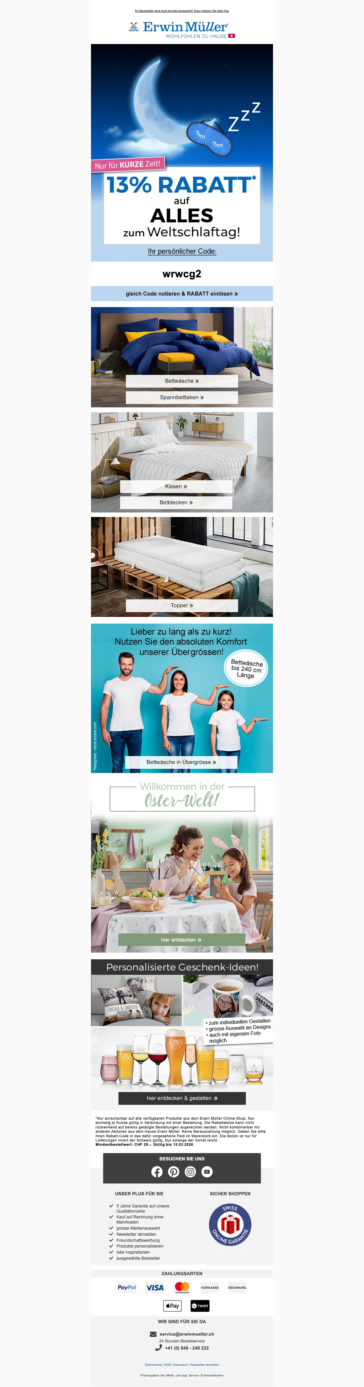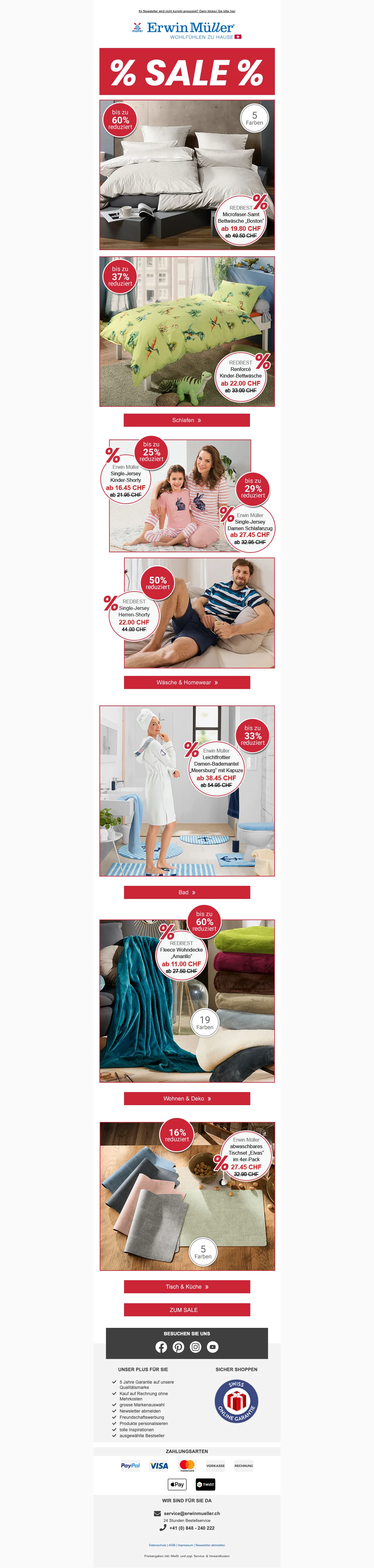Du hast im Erwin Müller Bettwäsche Sale ordentlich zugeschlagen - dein Warenkorb ist voll! Im Angebot hast du dich bereits mit der angegebenen Lieferfrist vertraut gemacht. Im Warenkorb unten links siehst du nun ein Feld, wo du einen Erwin Müller Gutscheincode eintragen kannst. Diesen bekommst du in der Regel bei uns auf saleduck.ch. Kopiere ihn dir von uns, füge ihn an dieser Stelle in das Feld ein und genieße deinen extra Rabatt! Yeah! Als Zahlungsmethoden stehen dir Sofortüberweisung, PayPal, Kreditkarte, Vorauskasse und auf Rechnung zur Verfügung. Beim Erwin Müller Online Shop kannst du im Übrigen auch telefonisch, per Fax oder aber auch per E-Mail bestellen. Die Versandkosten betragen pauschal CHF 6.95 und dabei bleibt es auch, selbst wenn du Teillieferungen bekommen solltest. Du genießt bei Erwin Müller ein 14-tägiges Rückgaberecht (davon ausgenommene Artikel siehe Webseite). Die Retoure erfolgt auf deine Kosten.