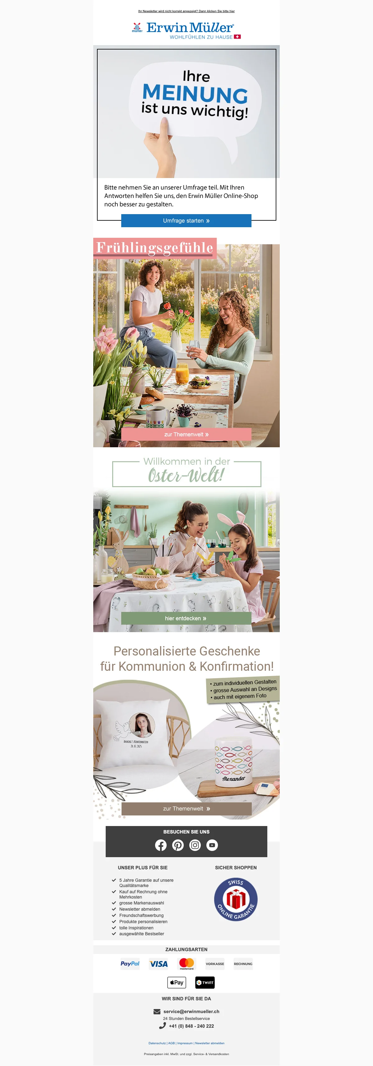 Wer sich heute bis zur Schweizer Webseite des Erwin Müller Online Shop (vor)klickt, hat wohl nur die tolle Bettwäsche im Kopf oder will sich mit einer der super kuscheligen Wohndecken eindecken (im wahrsten Sinne des Wortes!). Dabei ist die Entstehungsgeschichte von Erwin Müller Schweiz doch mindestens genau interessant, wie das tolle Sortiment rund ums heimelige Zuhause! Begonnen hat als im Jahre 1951 im beschaulichen Lauterbach in Schwaben. Der Firmengründer war damals gerade mal 21 Jahre alt, als er im heimischen Elternhaus die Basis für den heutigen Textilgroßhandel legte. Mit seinem Vorkriegs-Opel P4 düste er damals zu seinen ersten Kunden um günstige Wohntextilien anzupreisen. Zu Beginn der 60er Jahre kam auch schon der erste Katalog auf den Markt und das Unternehmen vergrößerte sich immer mehr. Das Versandhaus Butinette wurde gegründet, die Marke Erwin Müller Hotelwäsche ebenso, die erste Filiale erblickte das Licht der Welt und... und... und. Was dabei aber immer gleich geblieben ist, ist die tolle Qualität, die auch du - hurra! - nun im Online Shop entdecken kannst!
