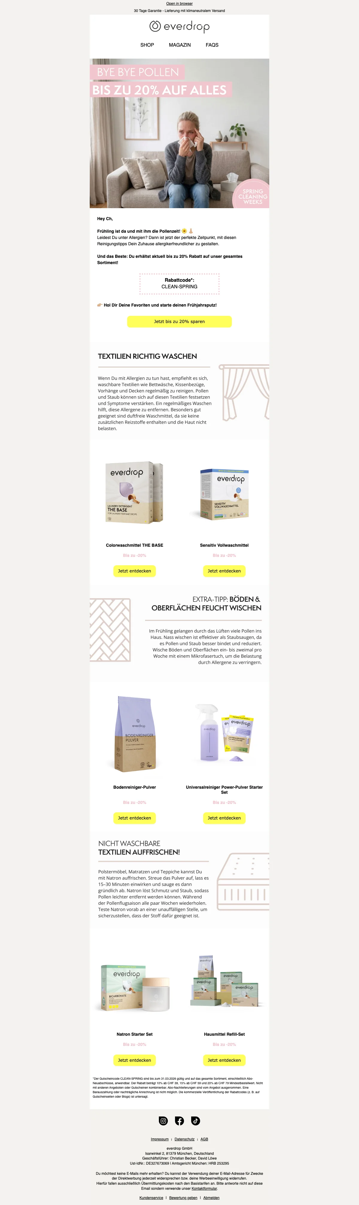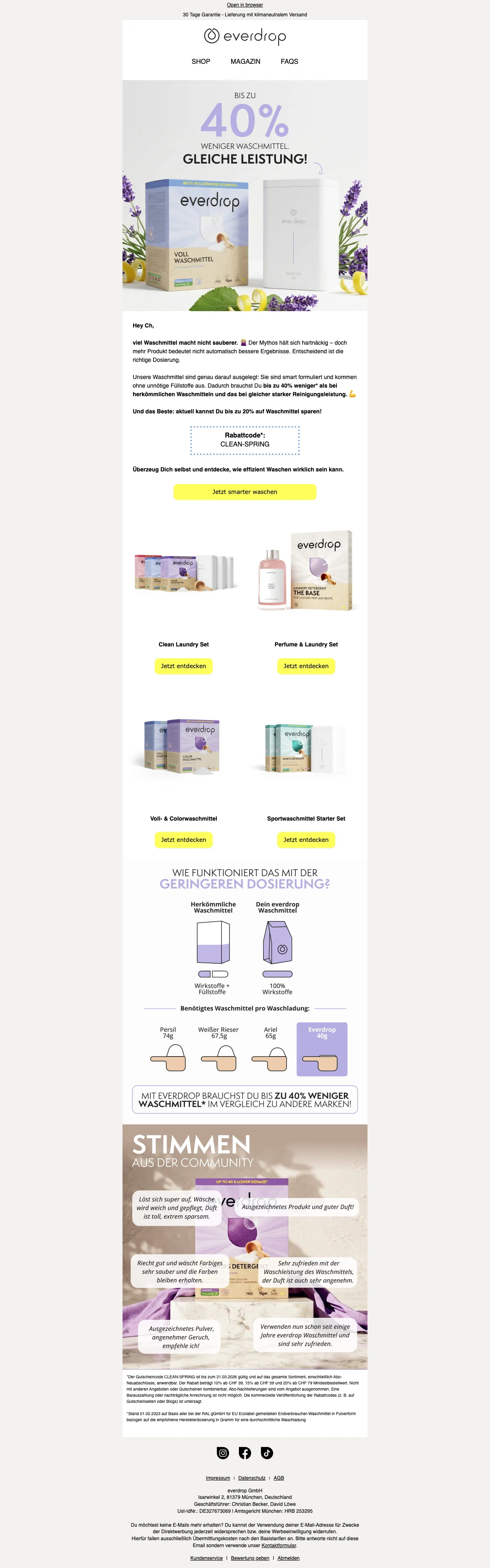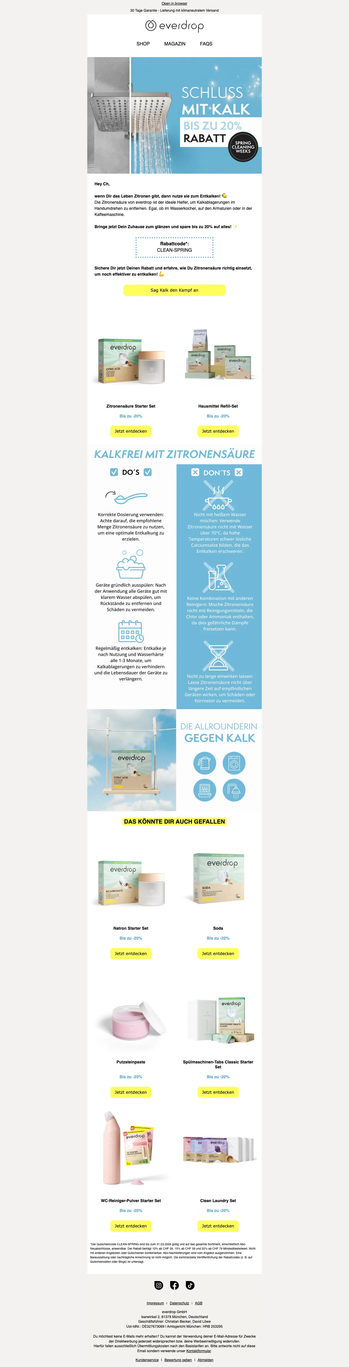 Nutze das Willkommensangebot und profitiere von 10 % Rabatt auf deine erste Bestellung. Diese Aktion gilt nur für Neukunden und ist eine großartige Möglichkeit, die nachhaltigen Produkte von everdrop auszuprobieren. Achte darauf, dass dein Mindestbestellwert CHF29 beträgt!