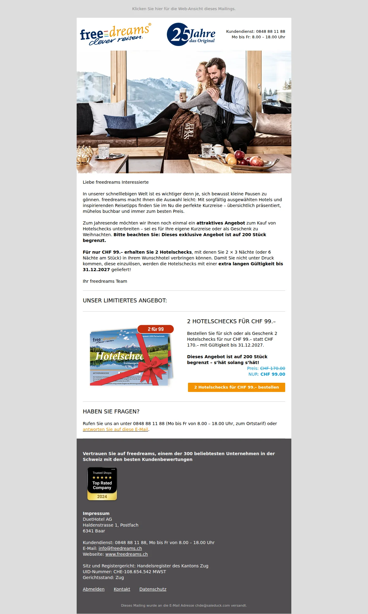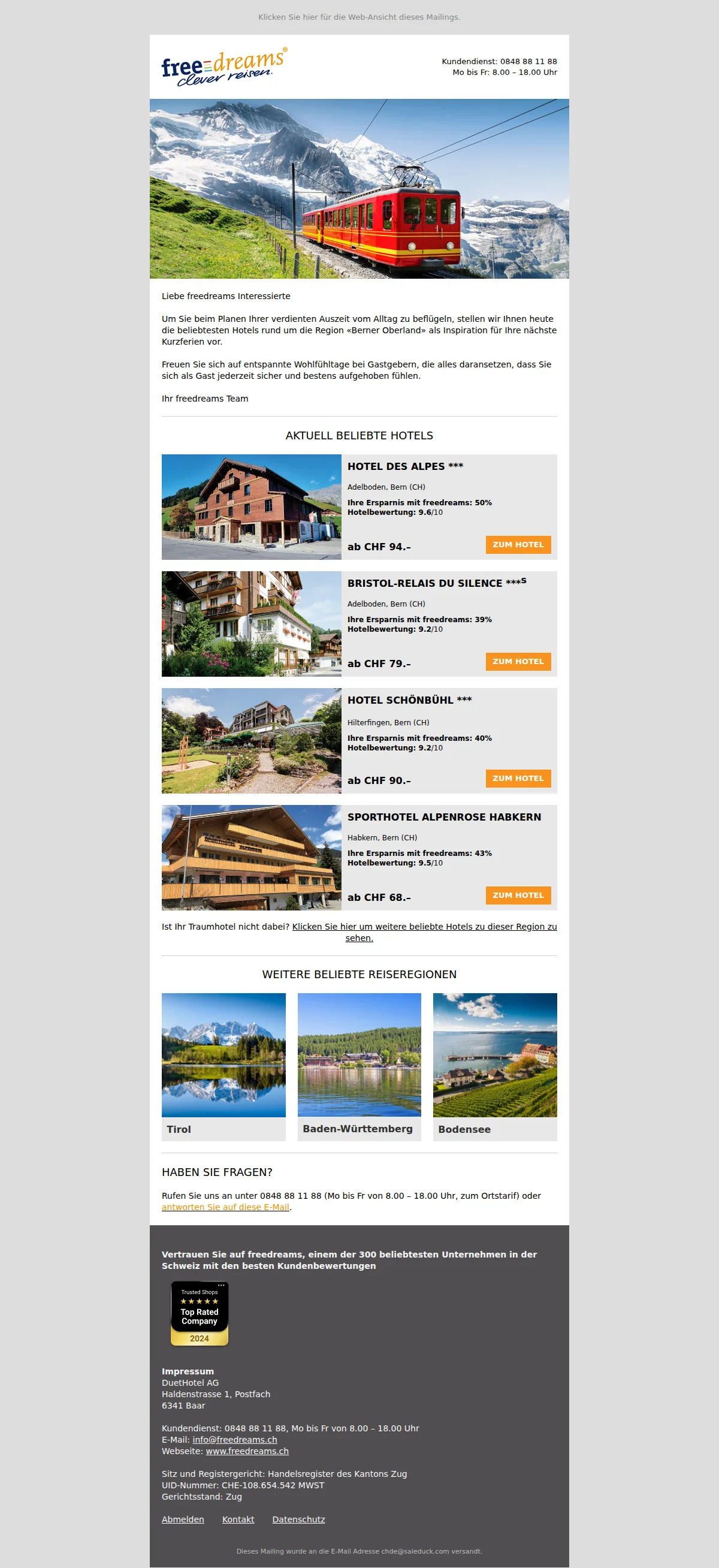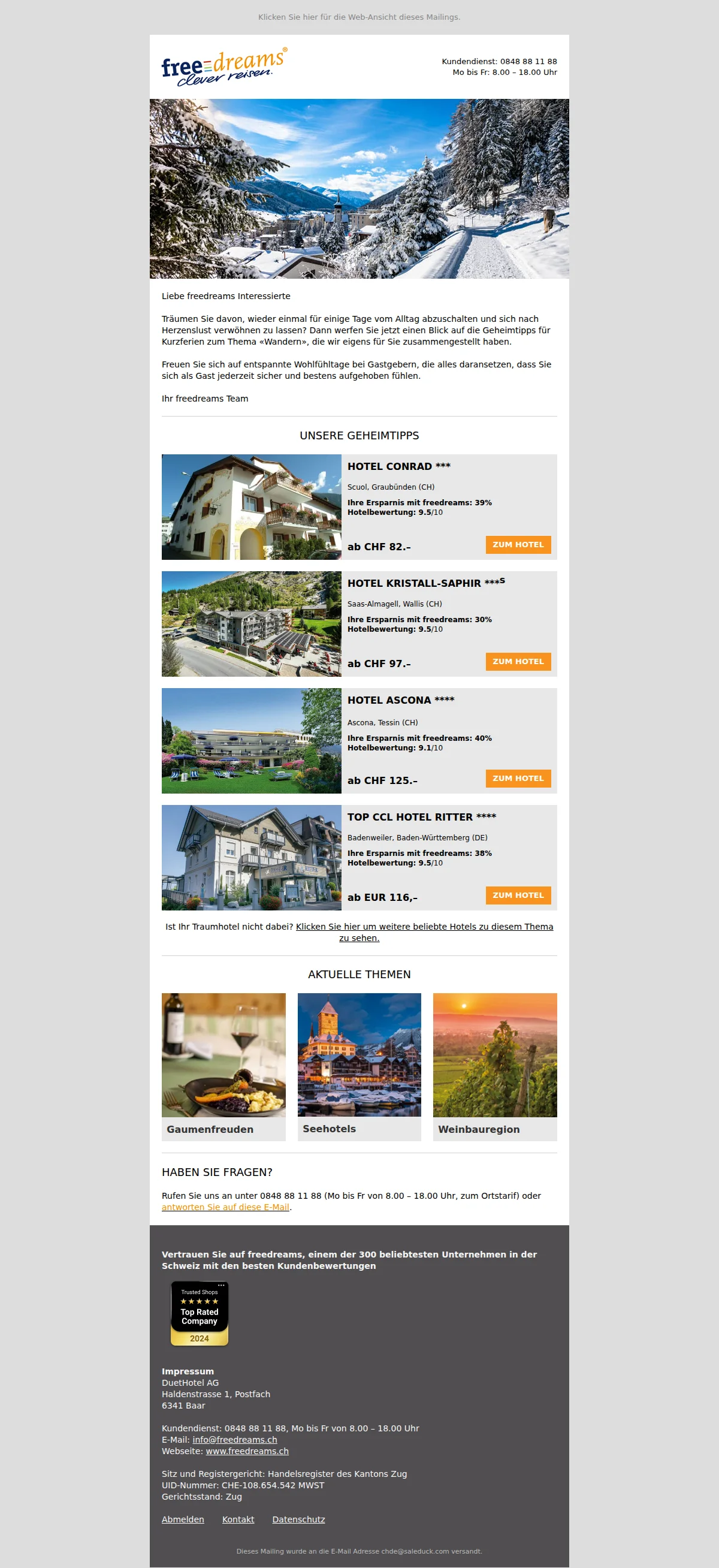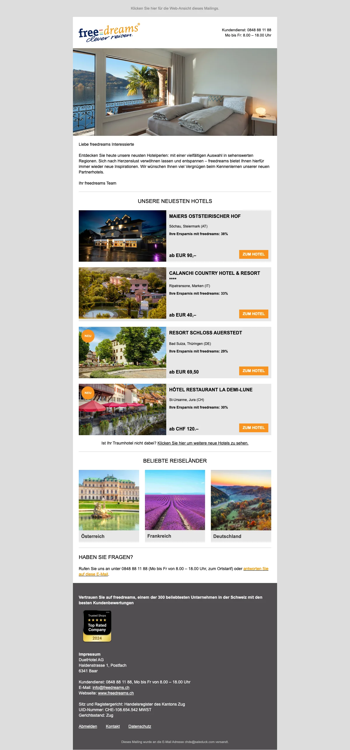 Freedreams.ch bietet dir über 2500 Hotels, überwiegend bestehend aus Drei- und Vier-Sterne-Hotels, in 18 europäischen Ländern zu unschlagbar günstigen Preisen an. Das Konzept ist dabei einzigartig, denn es basiert auf der Tatsache, dass Hotels unterschiedlich ausgelastet sind und wie man das clever ausnutzen kann, um Geld zu sparen. Auf diese Art und Weise erhältst du Angebote zu äußerst günstigen Konditionen und gleichzeitig ein Qualitätsversprechen, denn die Qualität wird regelmäßig kontrolliert und die Partnerhotels unterliegen strengen Auswahlkriterien.