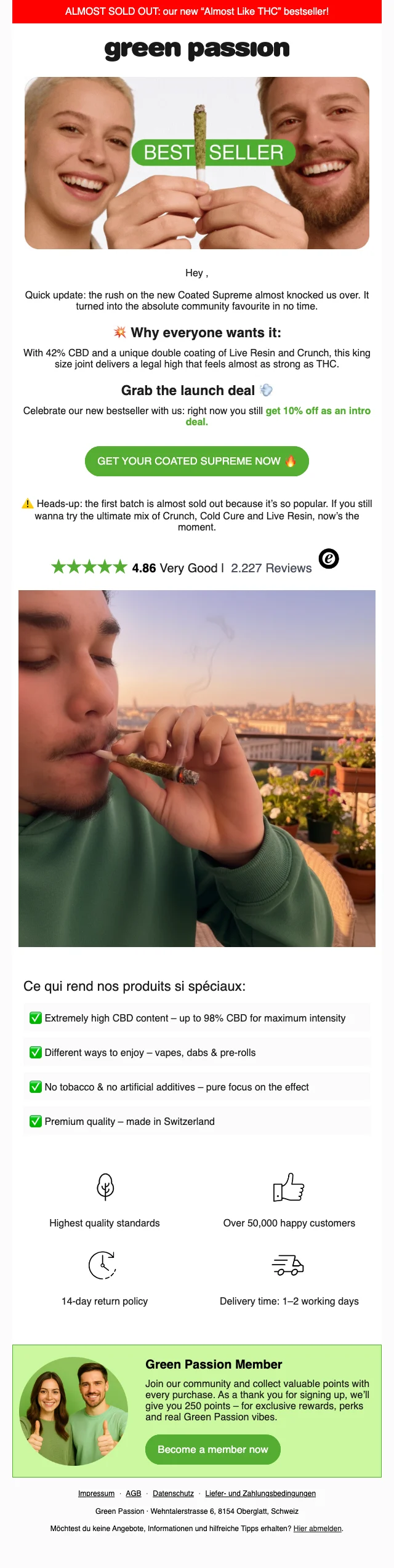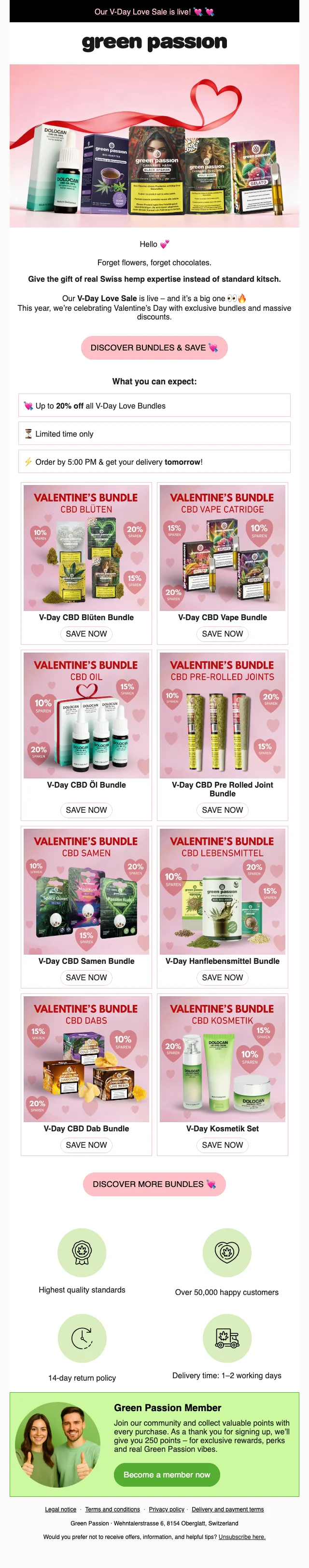 Sichere dir bis zu 20% Rabatt auf alle V‑Day Love Bundles mit CBD‑Blüten, Ölen, Vapes und Kosmetiksets. Bei Bestellung bis 17:00 Uhr erfolgt die Lieferung bereits am nächsten Werktag. 250 Punkte Bonus bei Anmeldung als Mitglied.
