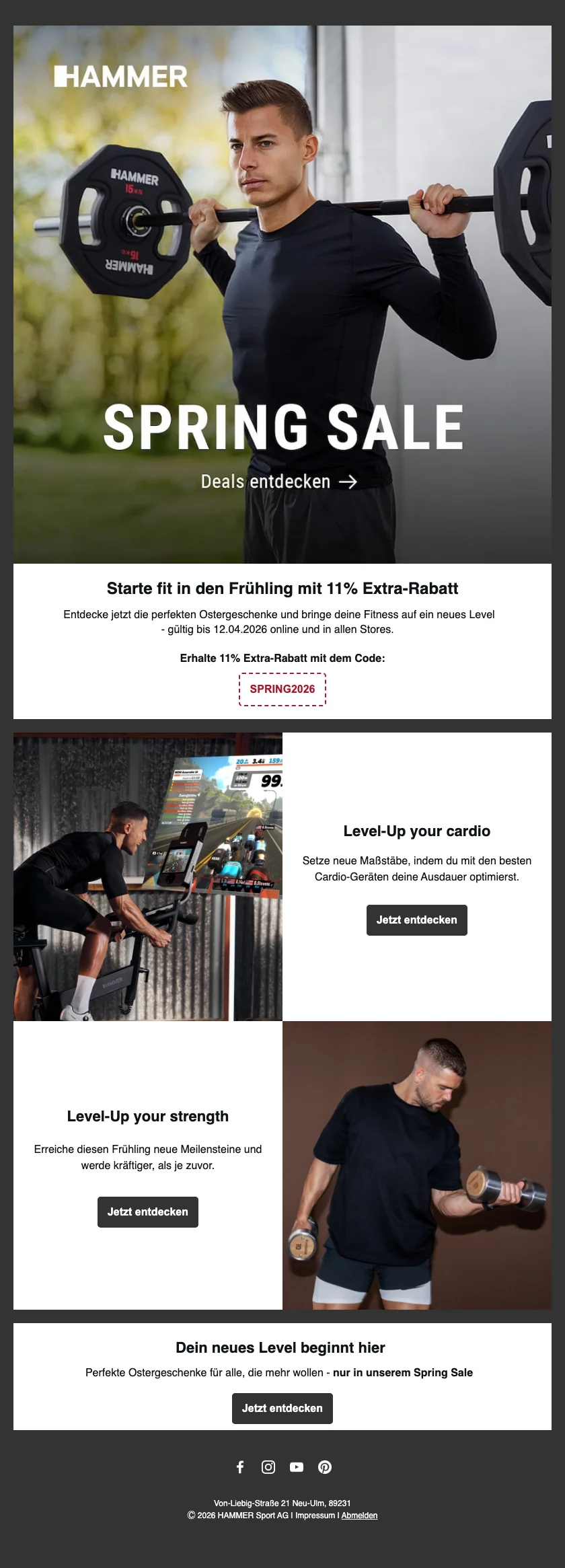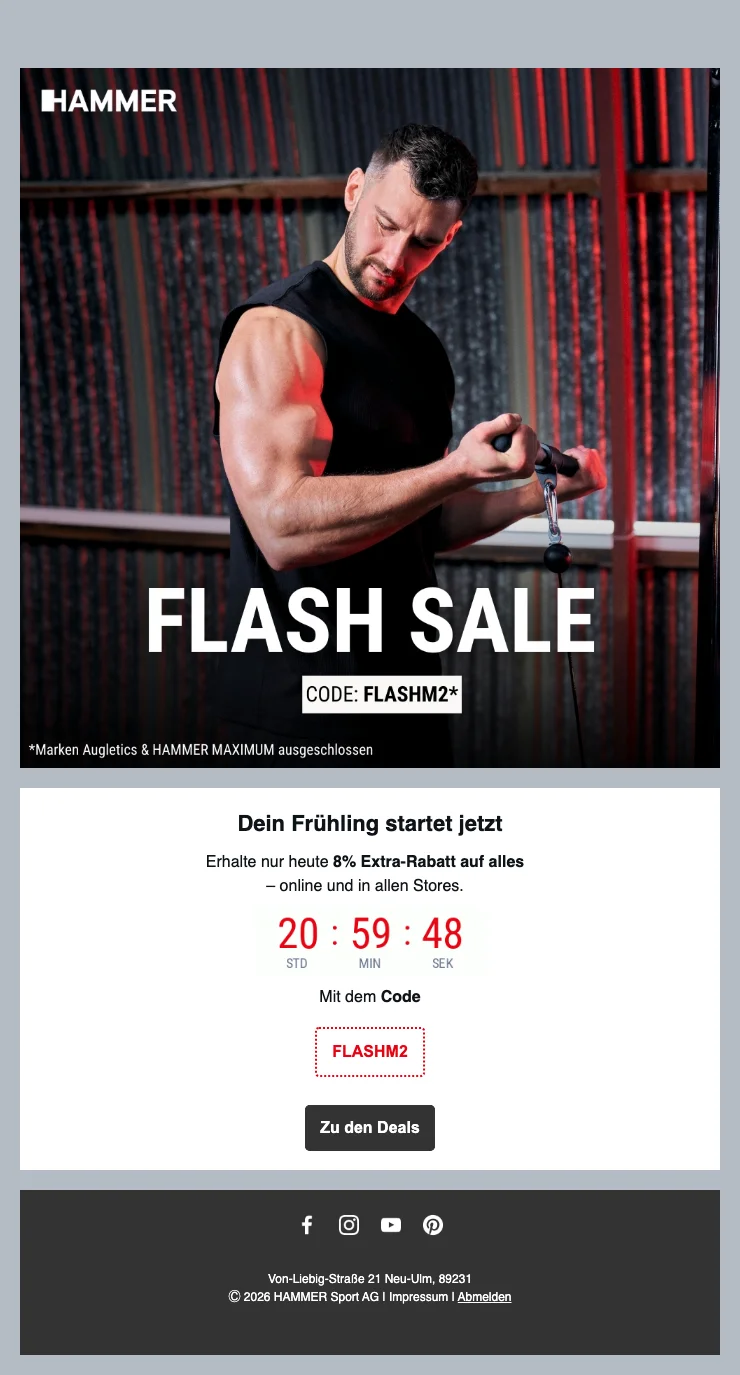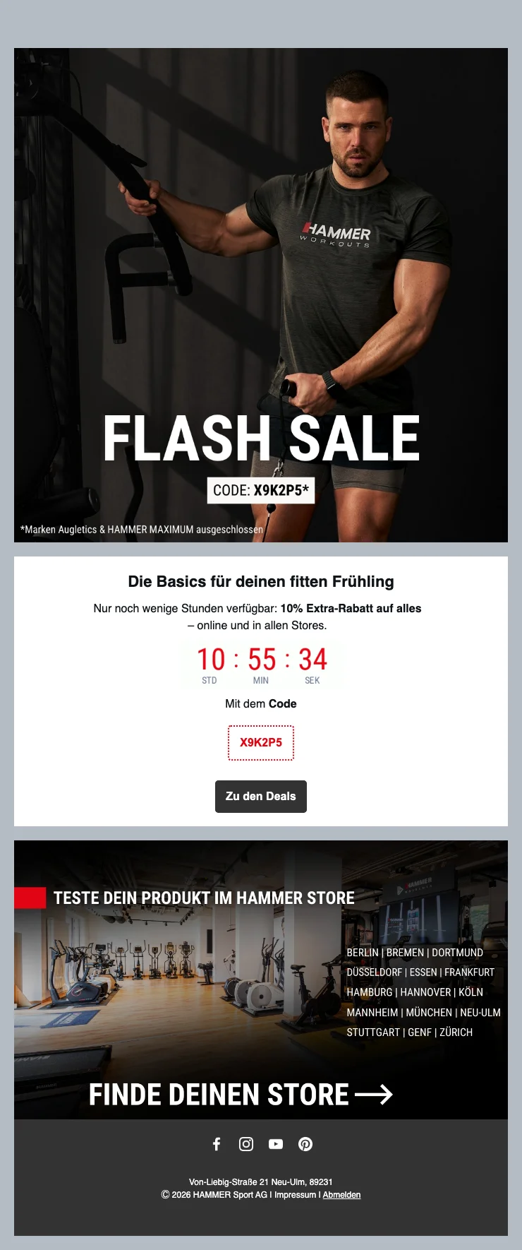 Möchtest Du Deine Fitnessziele bequem von zu Hause aus erreichen? Bei Hammer bekommst Du jetzt auf ausgewählte Fitnessgeräte für Zuhause ein Sonderangebot und sparst dabei 100 CHF. Starte durch und baue Ausdauer und Muskeln flexibel und hygienisch in Deinem eigenen Raum auf!