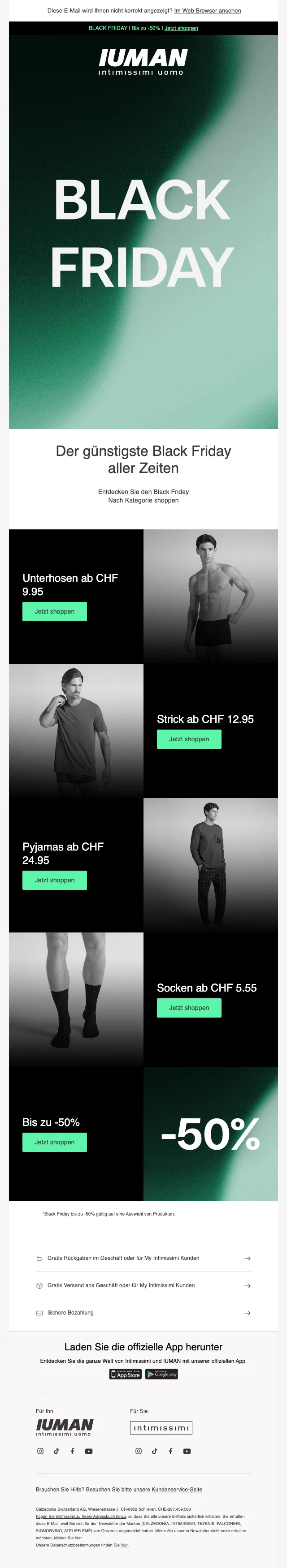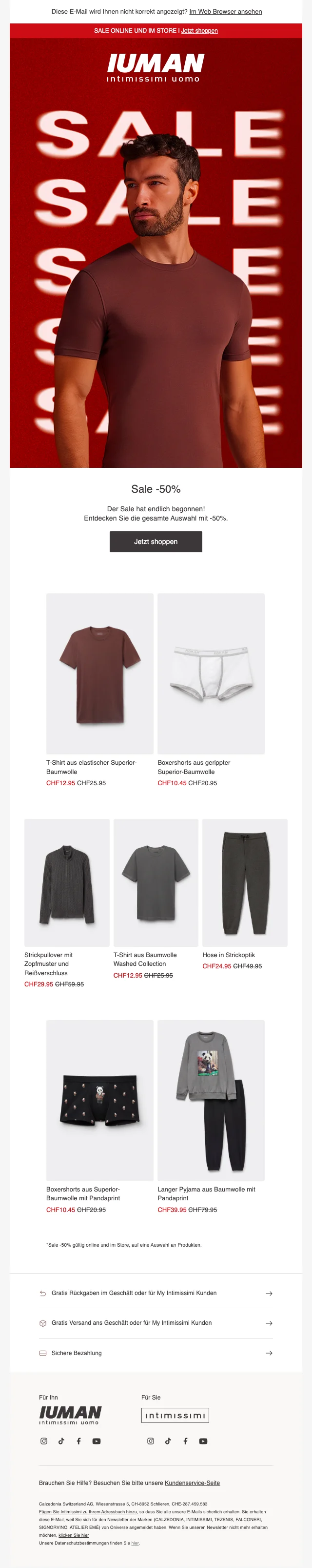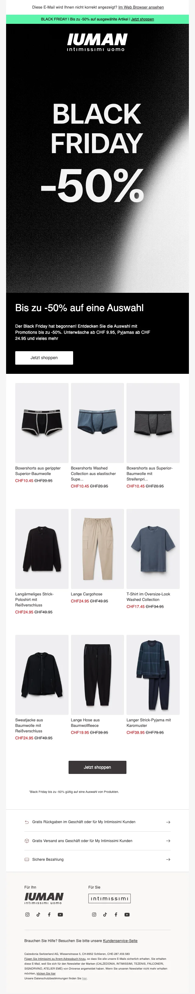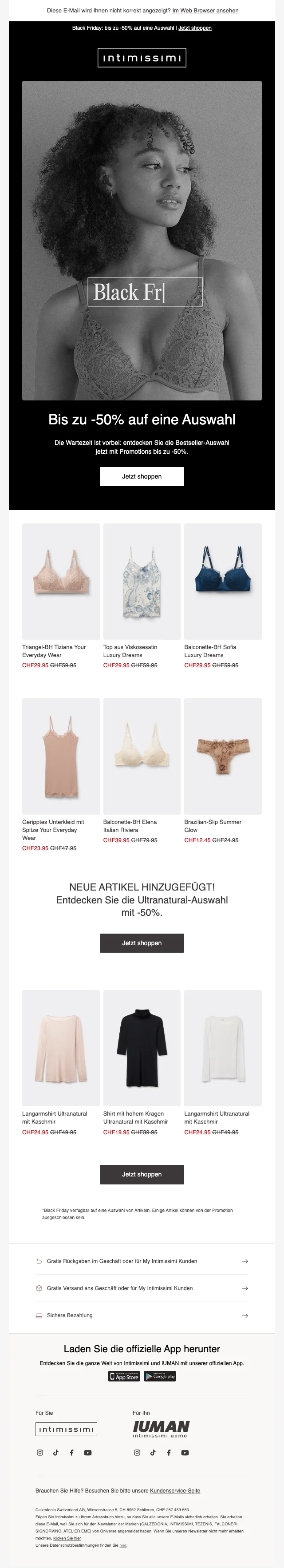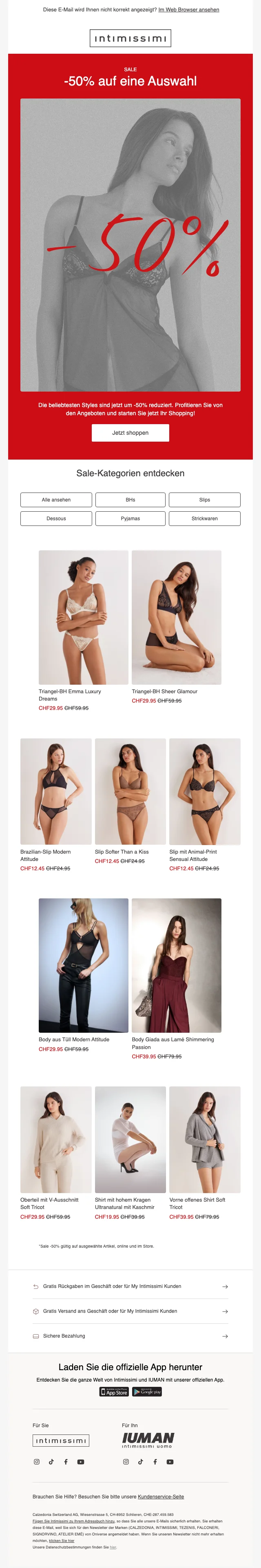 intimissimi Schweiz ist ein Unternehmen, der sich auf Mode, genauer gesagt Nachtwäsche und Bademode spezialisiert. Im Onlineshop findest du eine grosse Auswahl an Strickwaren, Nachtwäsche wie Tops und gemütliche T-Shirts, Boxershorts und vieles mehr. Das Sortiment richtet sich sowohl an Frauen als auch Männer und zeichnet sich durch ein äusserst gutes Preis-Leistungs-Verhältnis aus. Überdies gibt es die jeweiligen Produkte in vielen verschiedenen Farben und Grössen. Im Webshop findest du auch regelmäßig Promotionen, bei denen beispielsweise Vorteilspakete beworben werden. Zudem hast du die Möglichkeit, mithilfe eines intimissimi Gutschein Rabatte geltend zu machen. Die grössten Preissenkungen sind Ende November während Black Friday und Cyber Monday verfügbar.