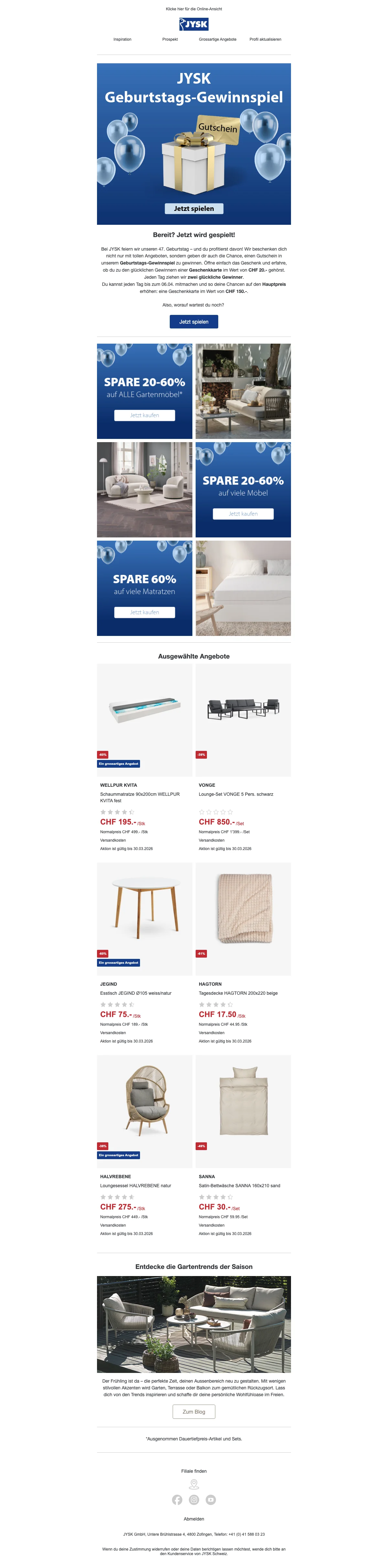 JYSK geburtstags-gewinnspiel CHF 20 gutschein täglich gewinnen