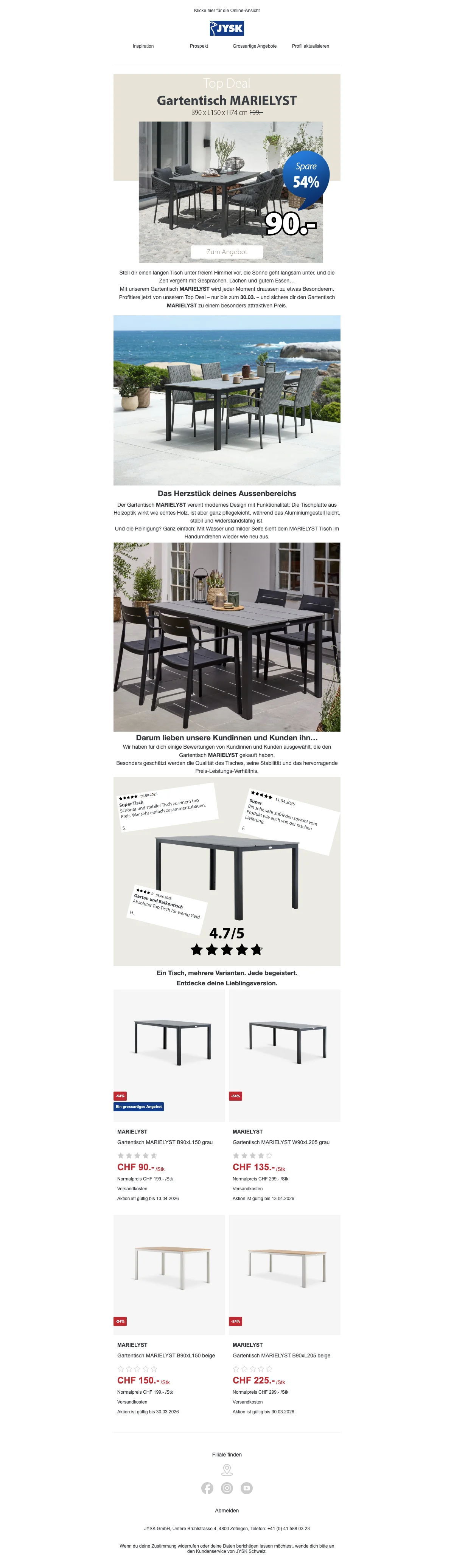 JYSK angebot MARIELYST -54%: gartentisch B90xL150 für CHF 90.-