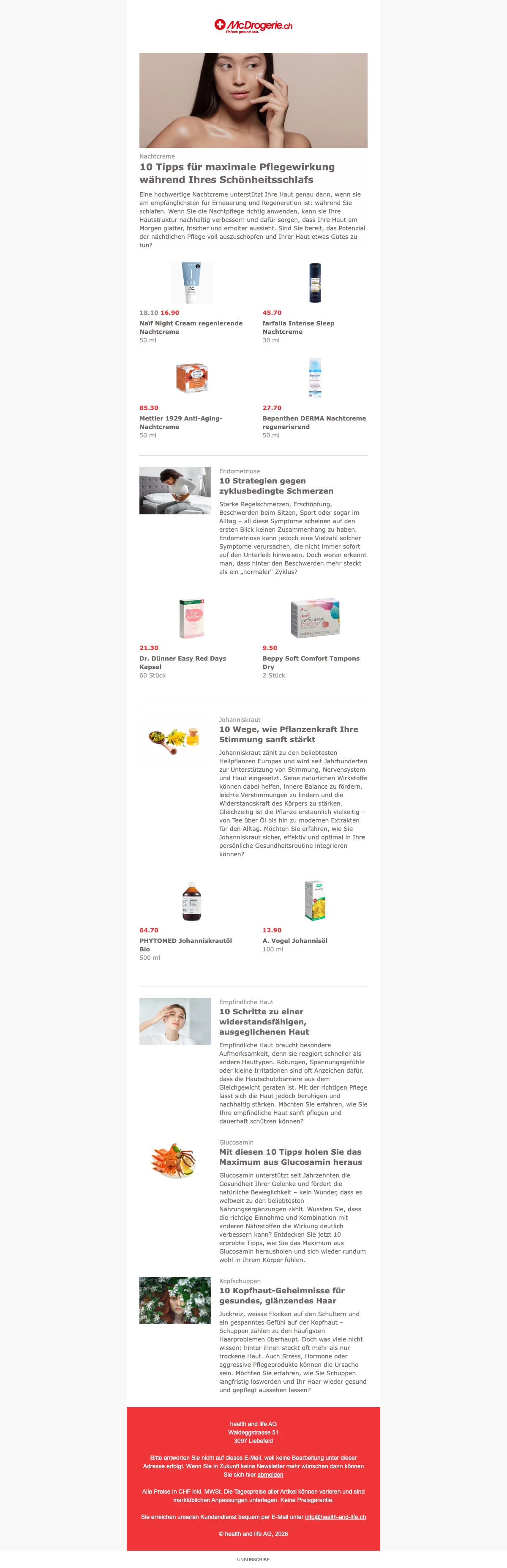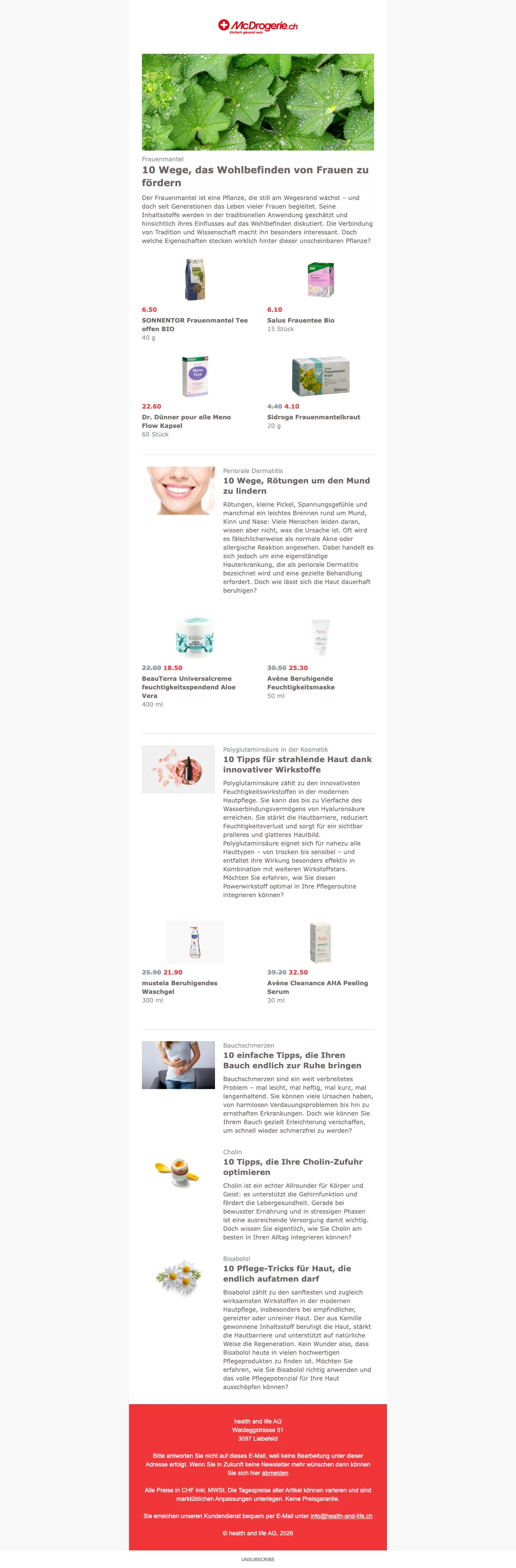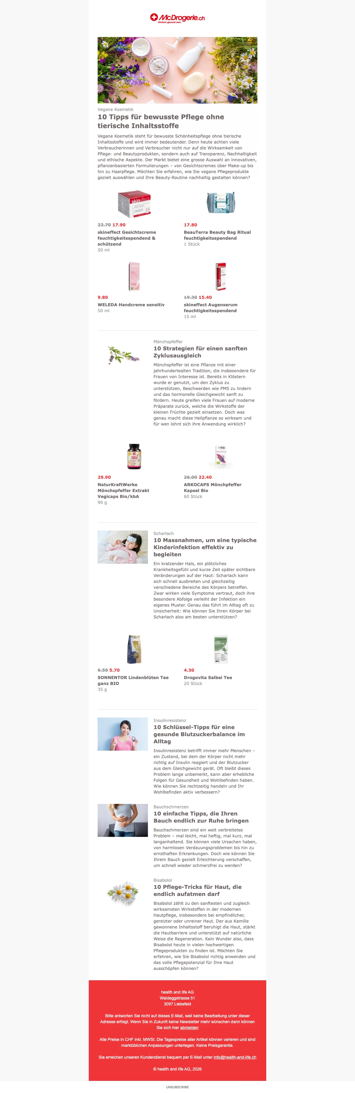 Wenn du auf der Suche nach günstigen Drogerieartikeln von bekannten Marken bist, dann ist McDrogerie, deine Schweizer Online Drogerie, genau richtig für dich. Auf mcdrogerie.ch findest du ein vielfältiges Sortiment an Medizin, Babyartikeln, Ernährungsprodukten und Nahrungsergänzungsmittel. Zusätzlich kannst du auch deine Kosmetik und Körperpflegeartikel günstig bestellen und sogar Artikel für deine Haustiere kaufen.