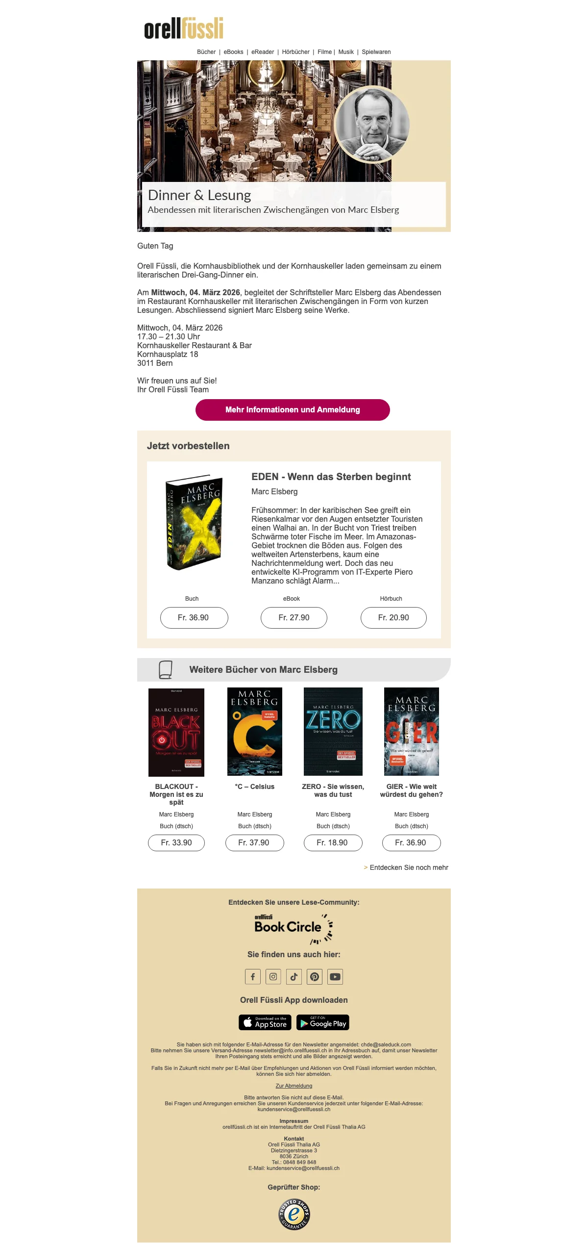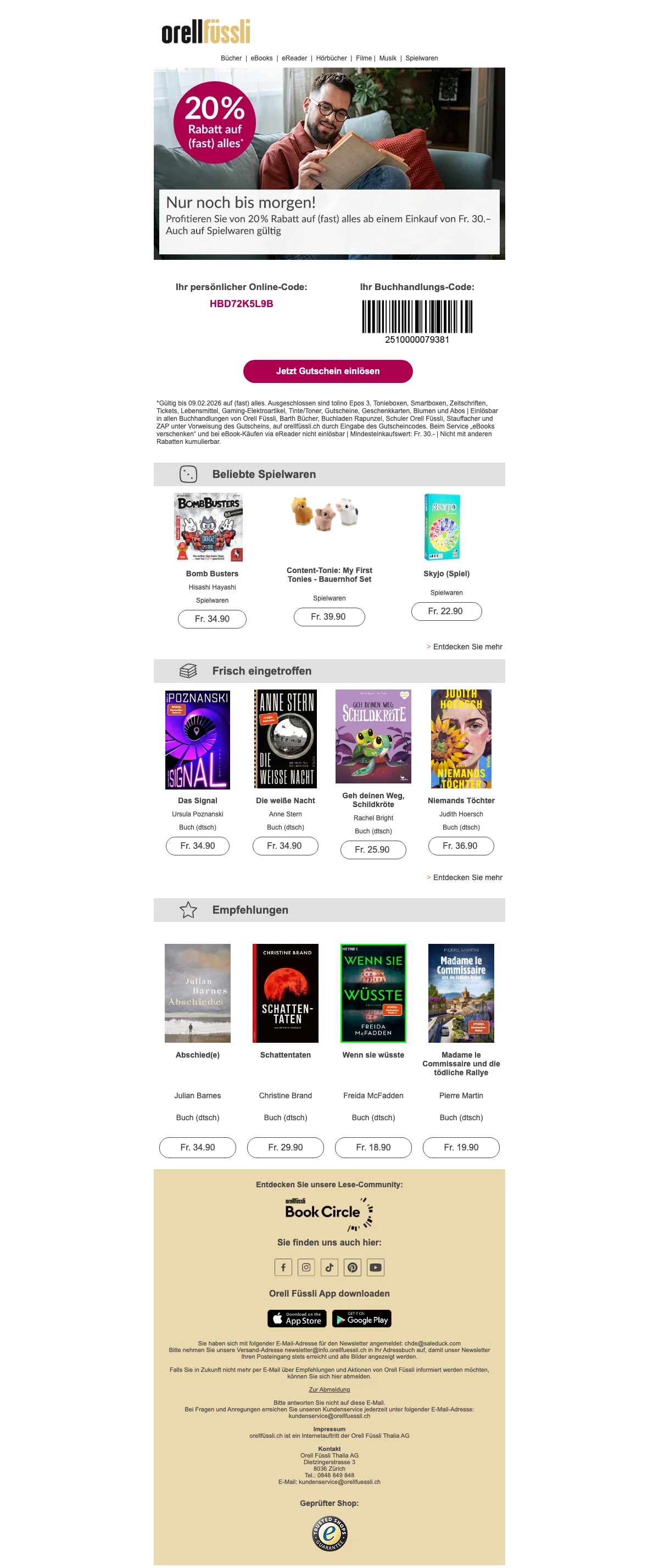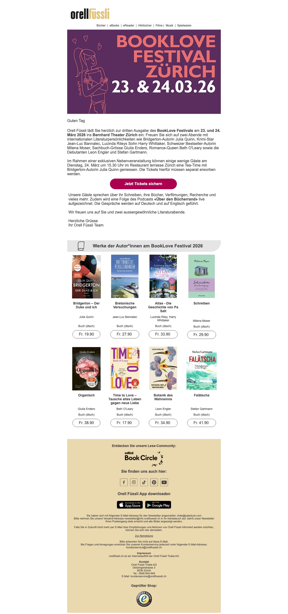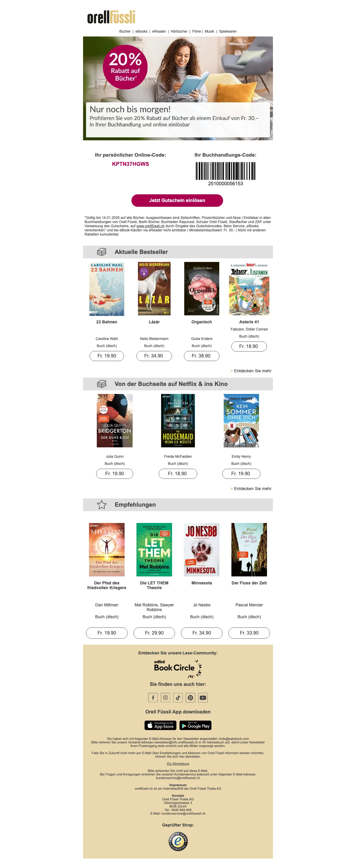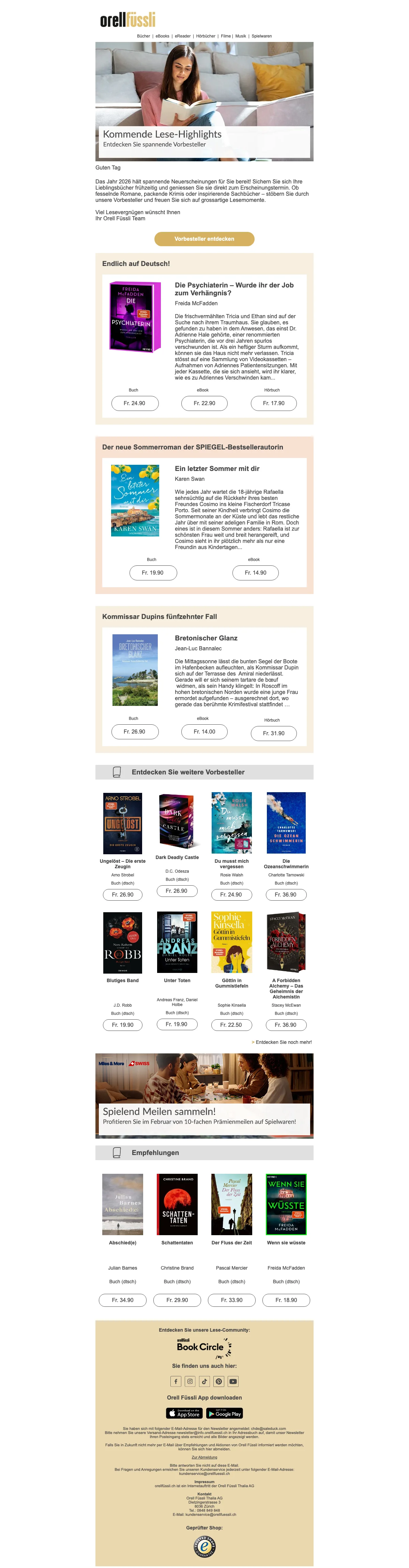 Brauchst du noch Lektüre für den Strand oder für die Badewanne? Dann besuche jetzt diesen Online-Shop und lasse dich von tollen Angeboten inspirieren. Orell Füssli stellt immer die besten Buchtipps und saisonale Empfehlungen für dich zusammen. Für eine bessere Übersicht sind die Bücher auch kategorisch sortiert, damit du alles rund um die Fußballeuropameisterschaft, Schweizer Bestseller oder Haus und Garten auf einen Blick findest. Dieser Online-Shop bietet jedoch nicht nur Bücher, E-Books und Hörbücher, sondern auch ein umfangreiches Sortiment an Filmen, Games, Musik und Papeterie.