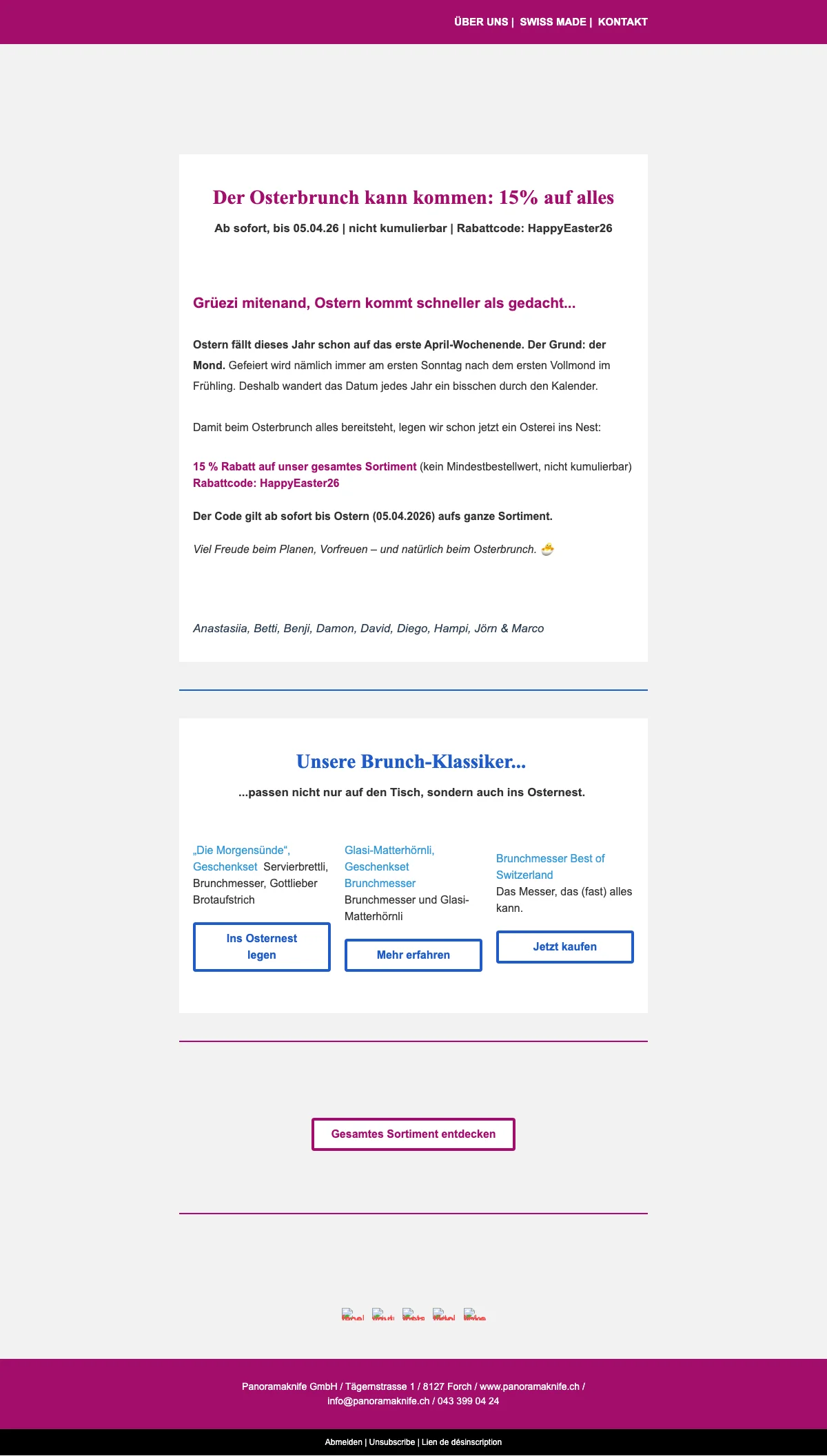 Du hast keine Lust mehr auf stumpfe Messer, minder qualitative Schneidebretter und möchtest endlich wieder Spaß bei Kochen haben? Dann haben wir genau den richtigen Onlineshop für dich! PanoramaKnife ist dein Ansprechpartner für hochwertige Schneidebretter und Premium-Messer. Die Inhaber sagen, dass Ihre Produkte eine Aussicht und ein Rückblick sind, gleichzeitig eine Erinnerung und ein Gefühl darstellen. Die einzigartigen Messer spiegeln die wunderschönen Berge und Landschaften der Schweiz wider, da die Gründer die schönen Dinge der Welt erlebbar machen wollten.