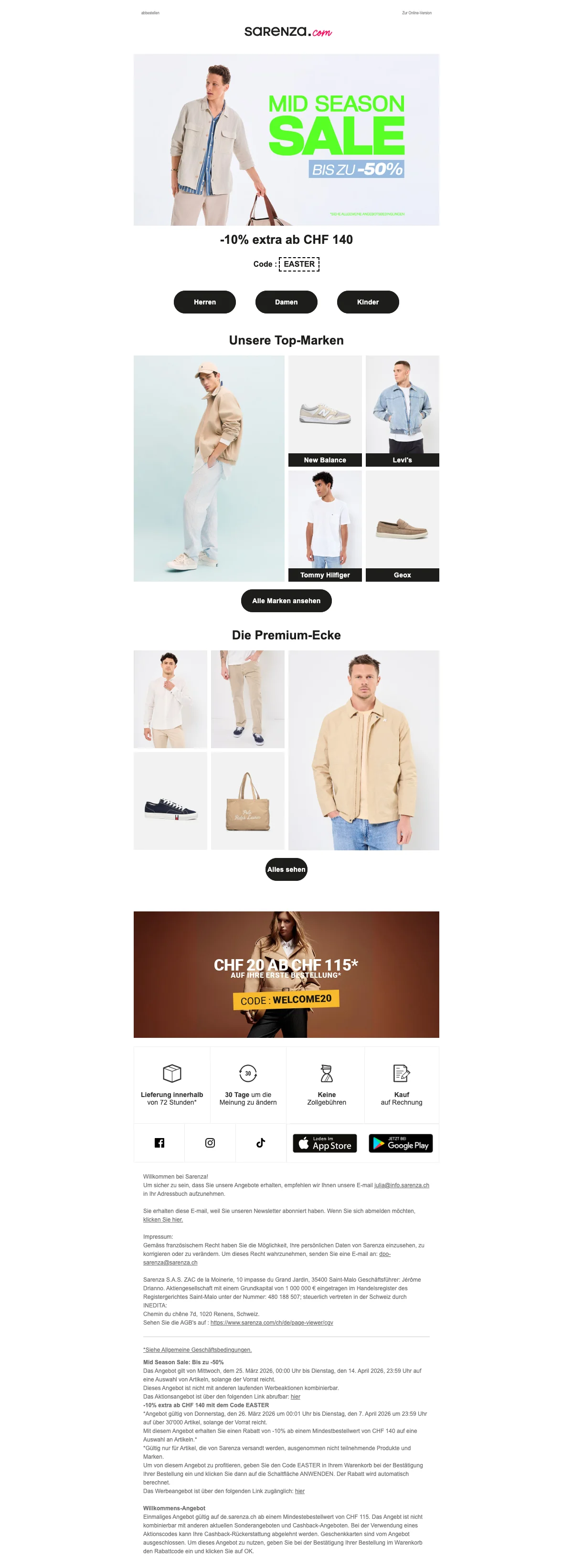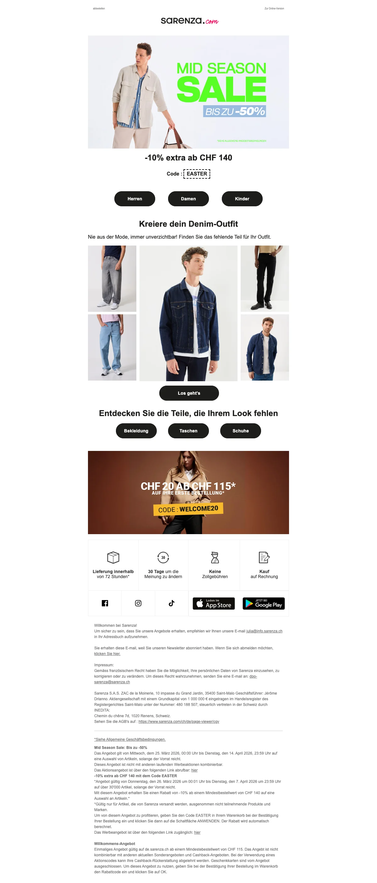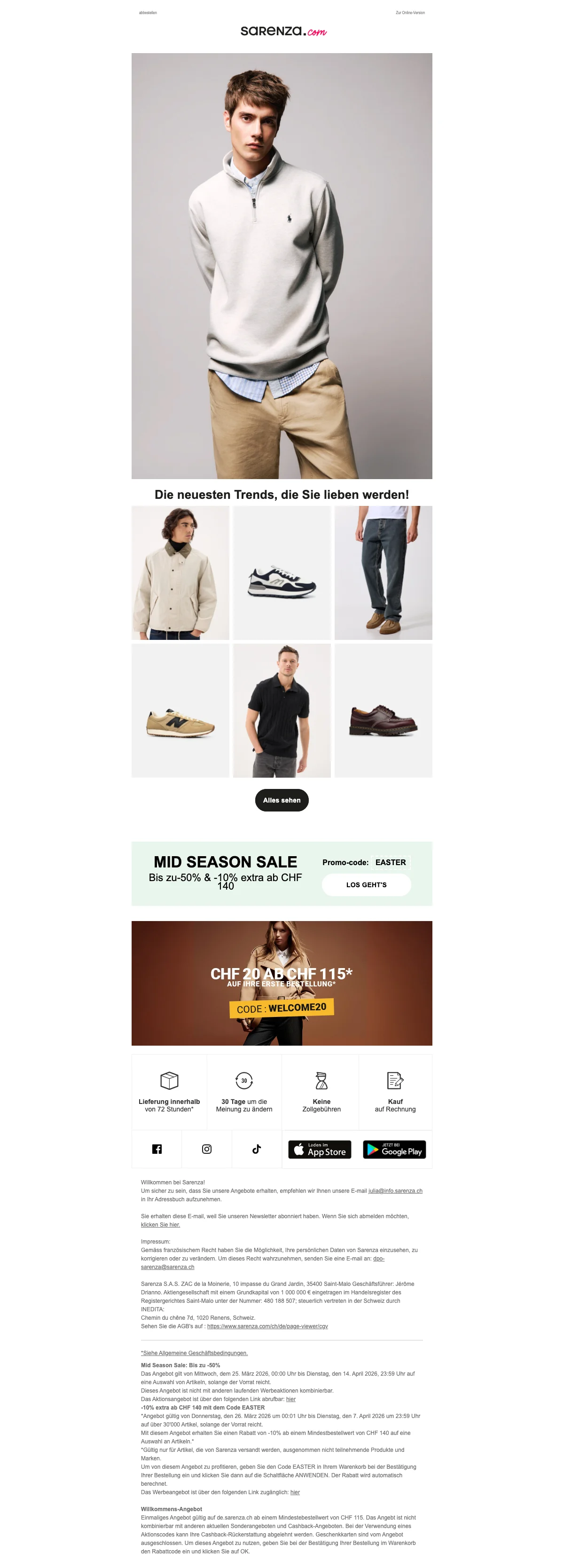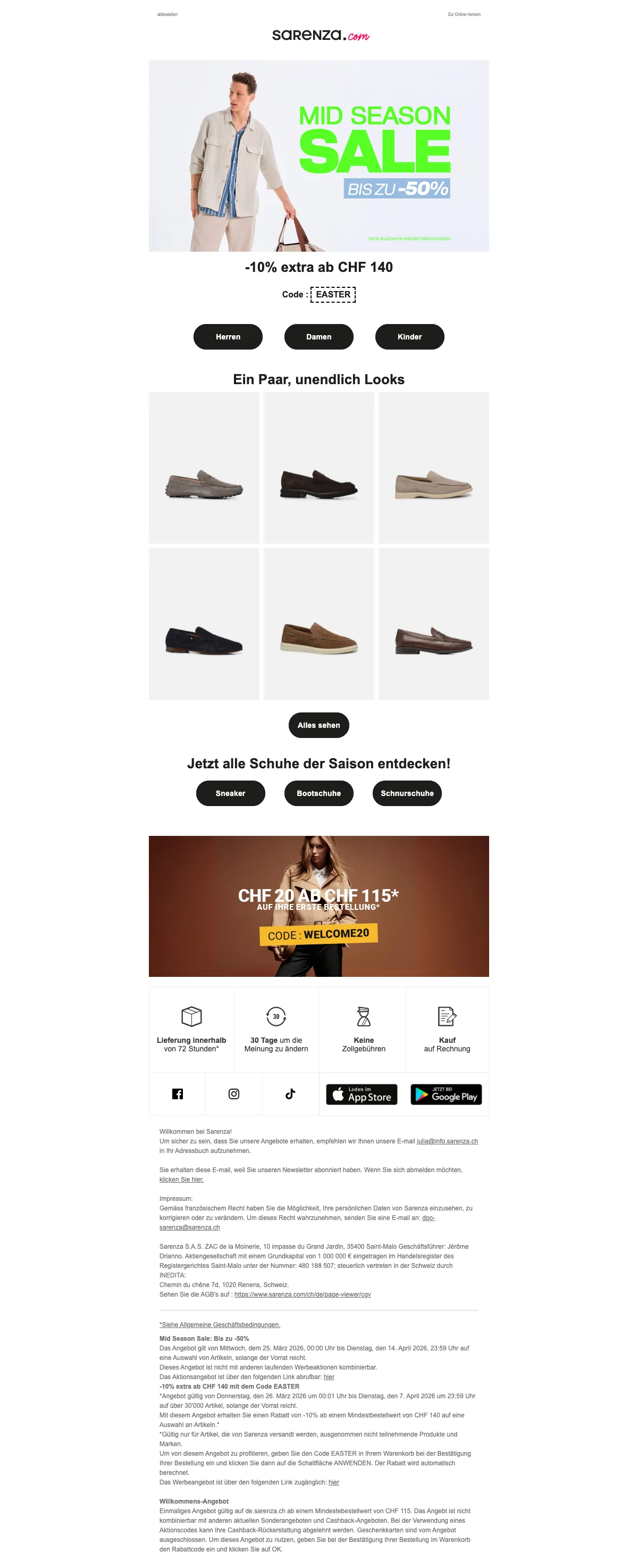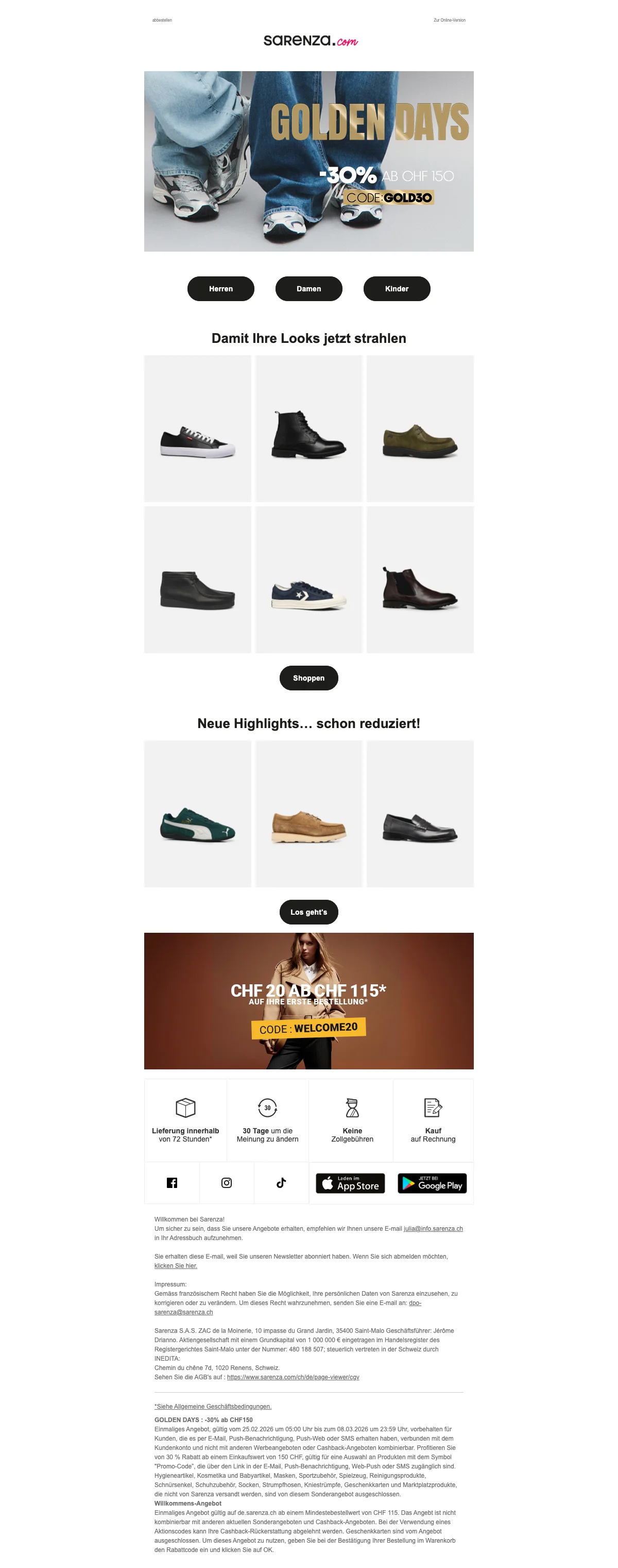 Damit deine Füße im Herbst und im Winter nicht frieren müssen, hat Sarenza die verschiedensten Schuhmodelle für dich im Sortiment. Passend zu den kälteren Jahreszeiten gibt es tolle Stiefel online zu kaufen. Von Cowboystiefeln, bis hin zu Overkneestiefel, gibt es bei Sarenza Schweiz wirklich alles! Eine Frau kann nie genug Schuhe haben, von dieser Aussage sind wir überzeugt. Also hole dir dein neues Paar Lieblingsstiefel und lasse sie dir einfach bequem vor die Haustür liefern. So angenehm kann Einkaufen sein. Kein nerviges Anstehen an der Kasse mehr.